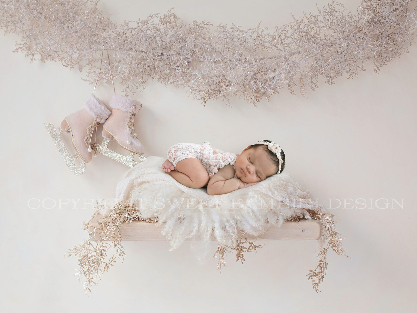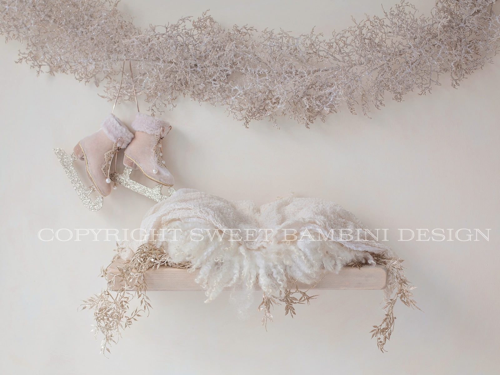 Christmas Newborn Digital Backdrop - Chunky wooden cream shelf backdrop with a pretty pair of ice skates and a sparkly Christmas garland, shot on a very lightly textured hand painted cream background.