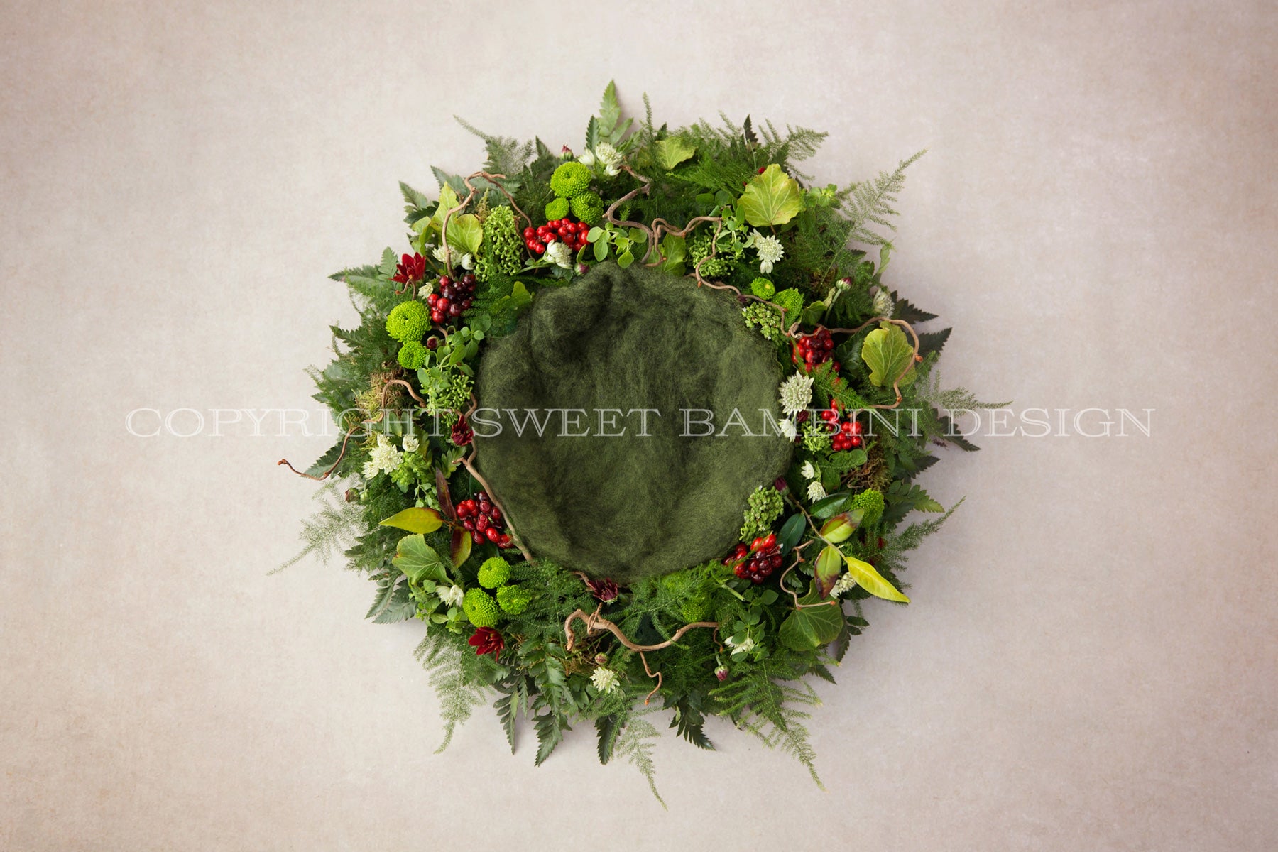 The Noelle nest is made predominantly with fresh plants & moss - it's a beautiful green nest decorated with red berries, shot in a slightly textured natural backdrop.