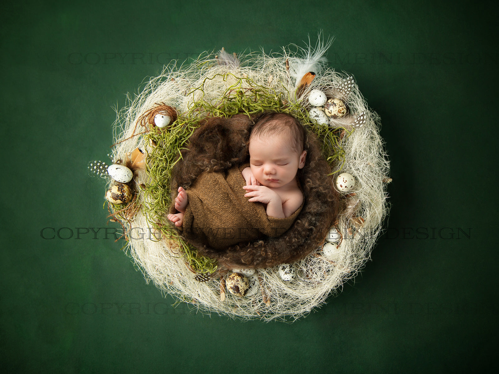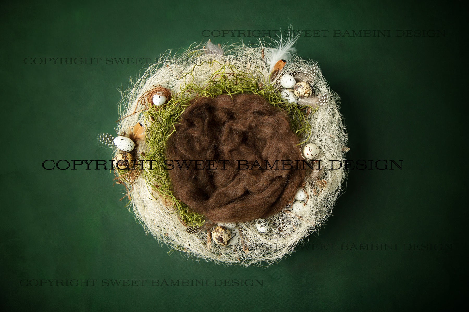 Easter Digital Backdrop for newborns - Natural nest with little eggs and a brown middle shot on a rich green background