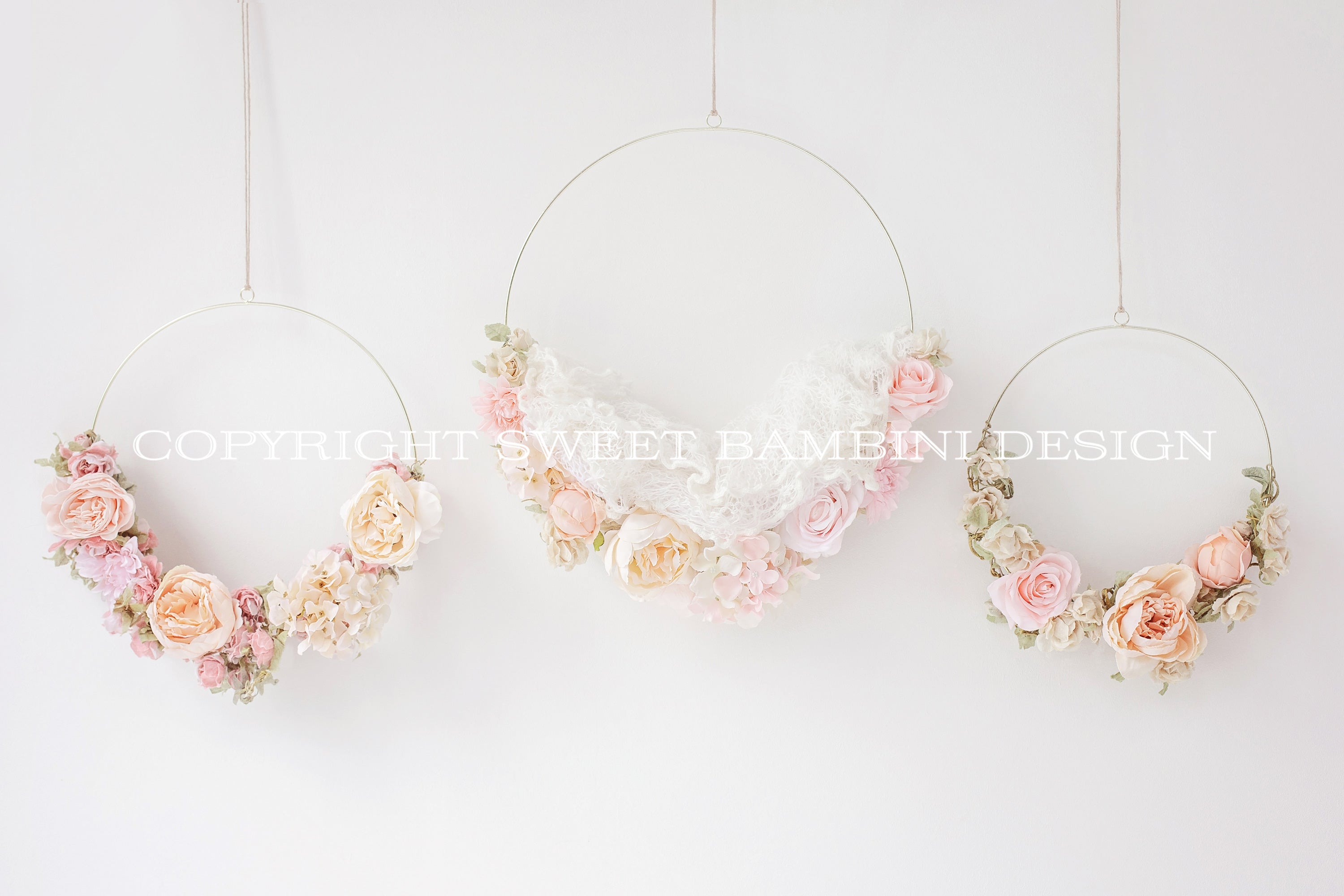 Beautiful newborn digital background - Three pretty floral hoops are made up of gorgeous muted toned florals, all photographed against a handpainted, lightly textured off-white background.