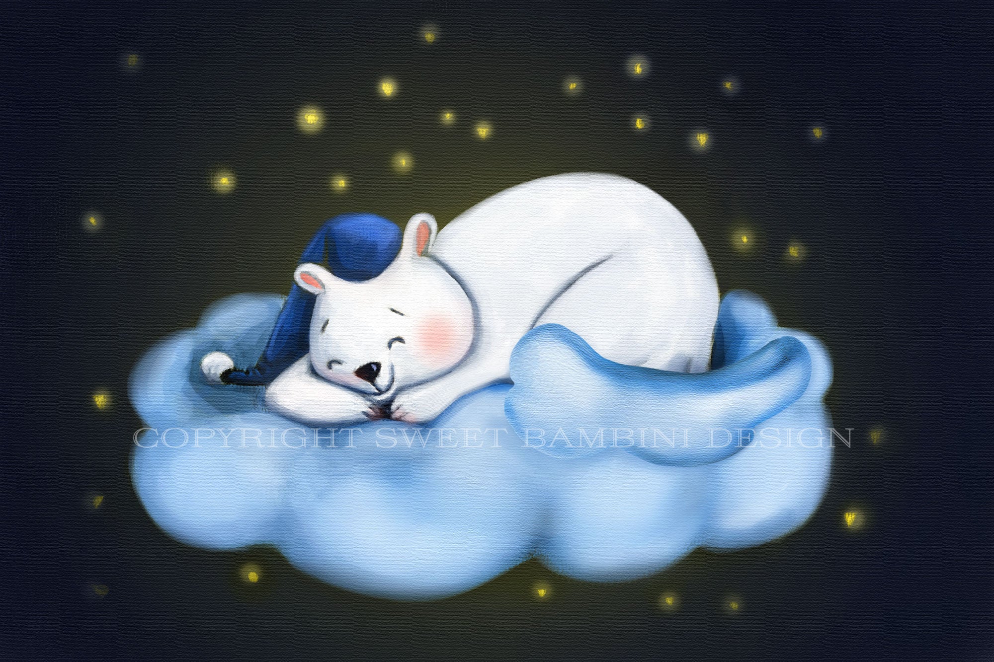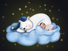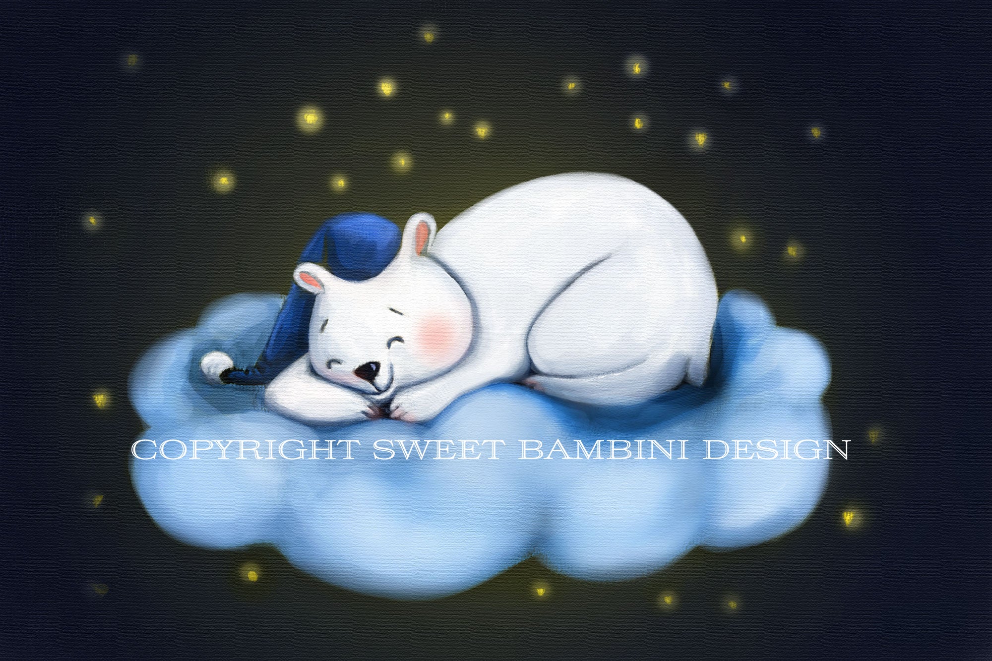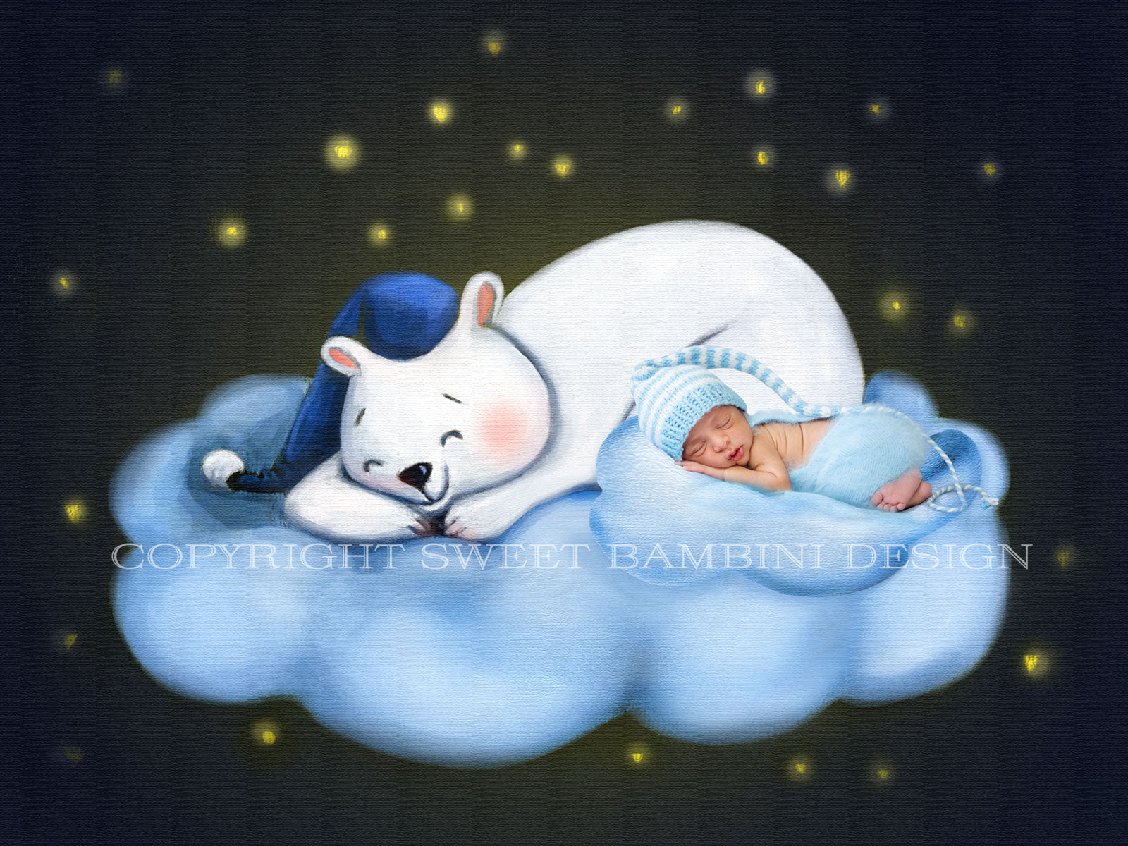 Newborn Digital Backdrop - Gorgeous baby blue cloud against a starry sky, with a cute sleepy Polar Bear.