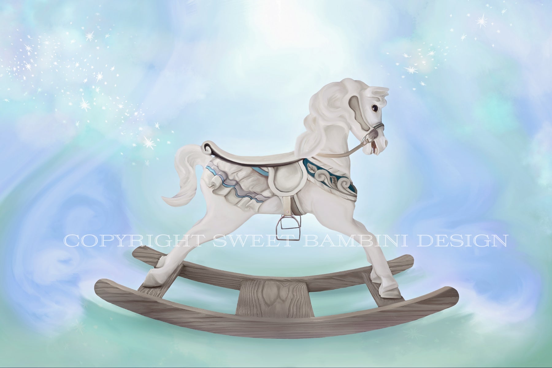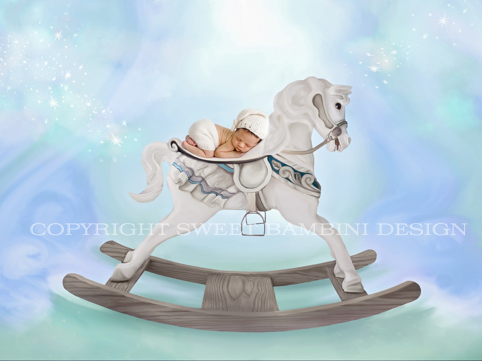 Newborn Digital Backdrop - Fantasy Rocking Horse on blue/minty background