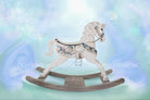 Gorgeous fantasy rocking horses on a watercolor effect backdrop with mixed baby blue/mint/sage green tones.