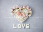 Newborn Digital Backdrop - heart shaped nest surrounded by subtle pink fresh roses and delicate white wax flowers.