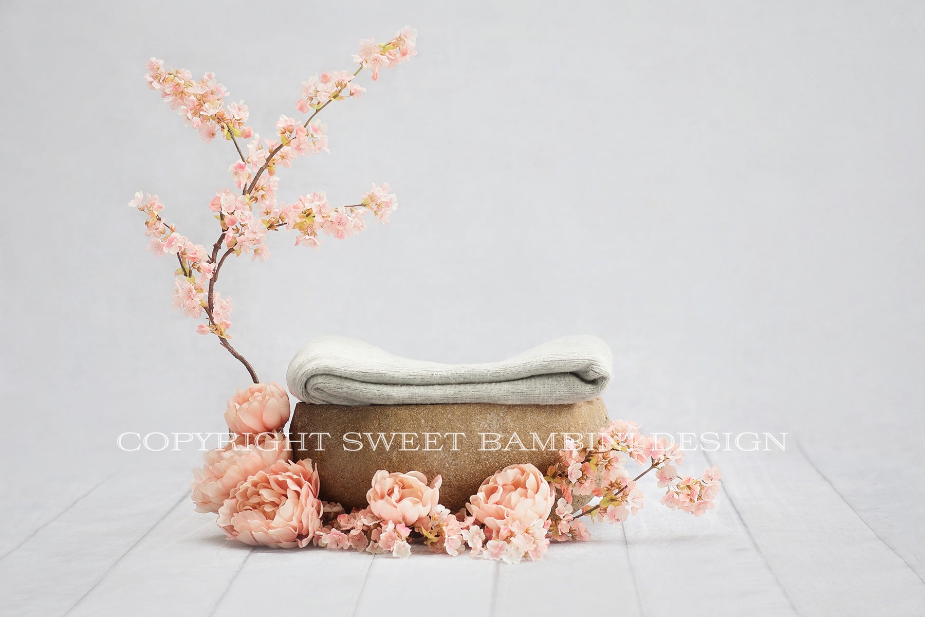 Newborn Digital Backdrop- Natural stone bowl with peach peonies and blossom