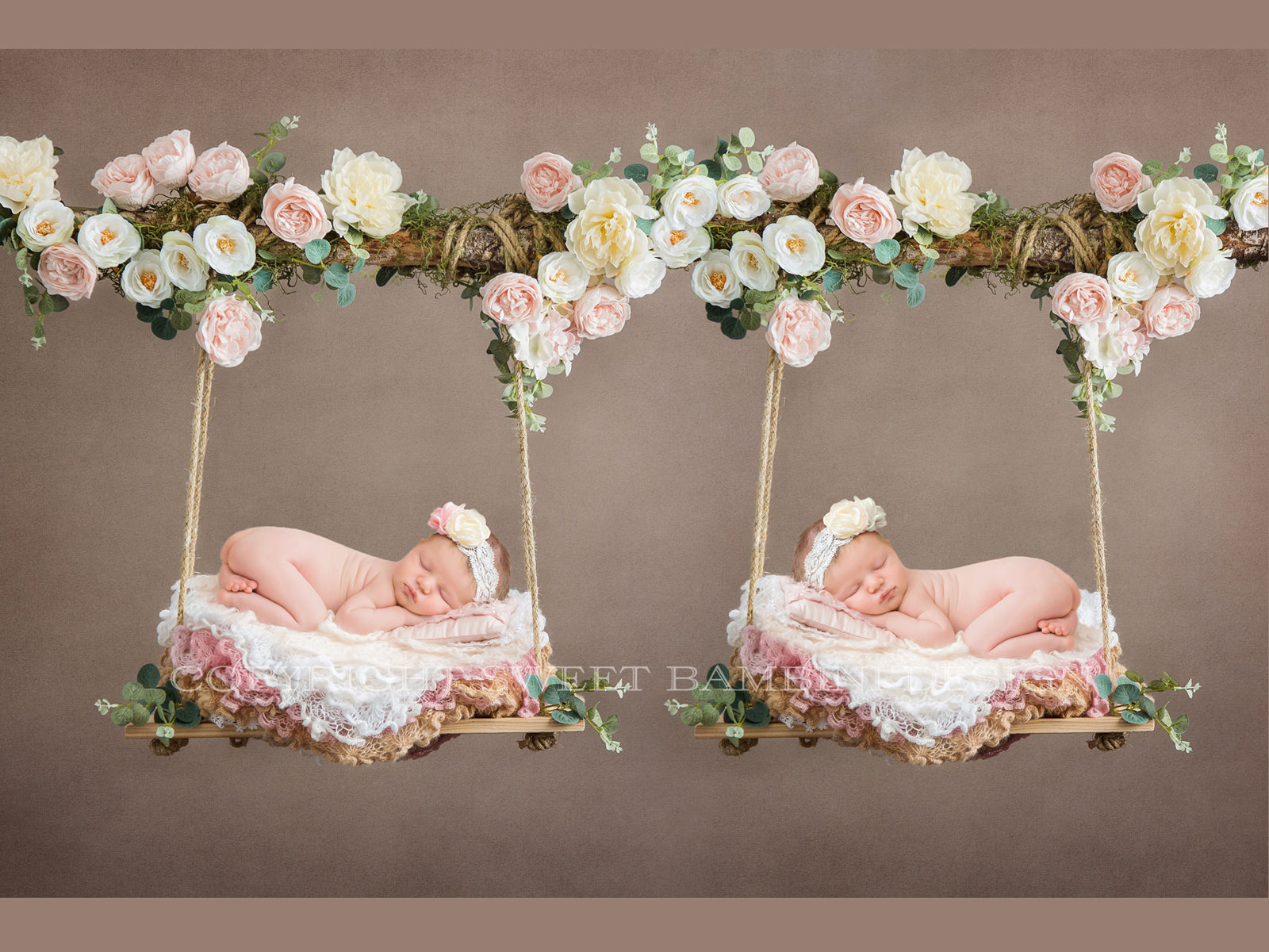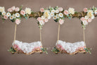 Newborn Digital Backdrop - Twin Floral wooden swings decorated with pink and white flowers, moss & eucalyptus