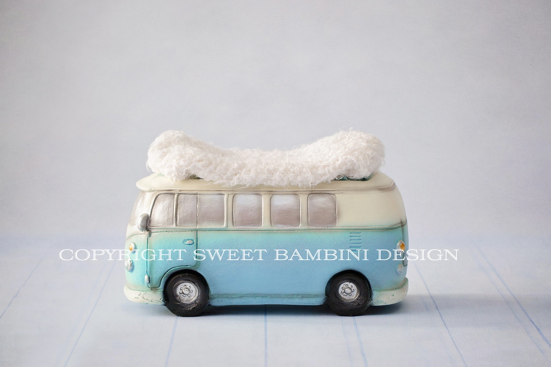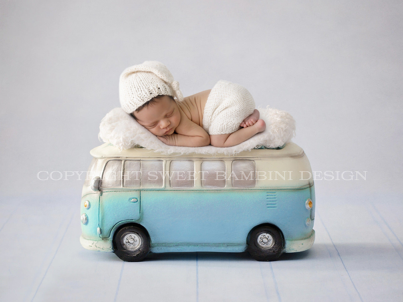 Newborn Digital Backdrop - VW camper van, shot on a bluey white floor - Perfect for girls or boys. Baby not included!