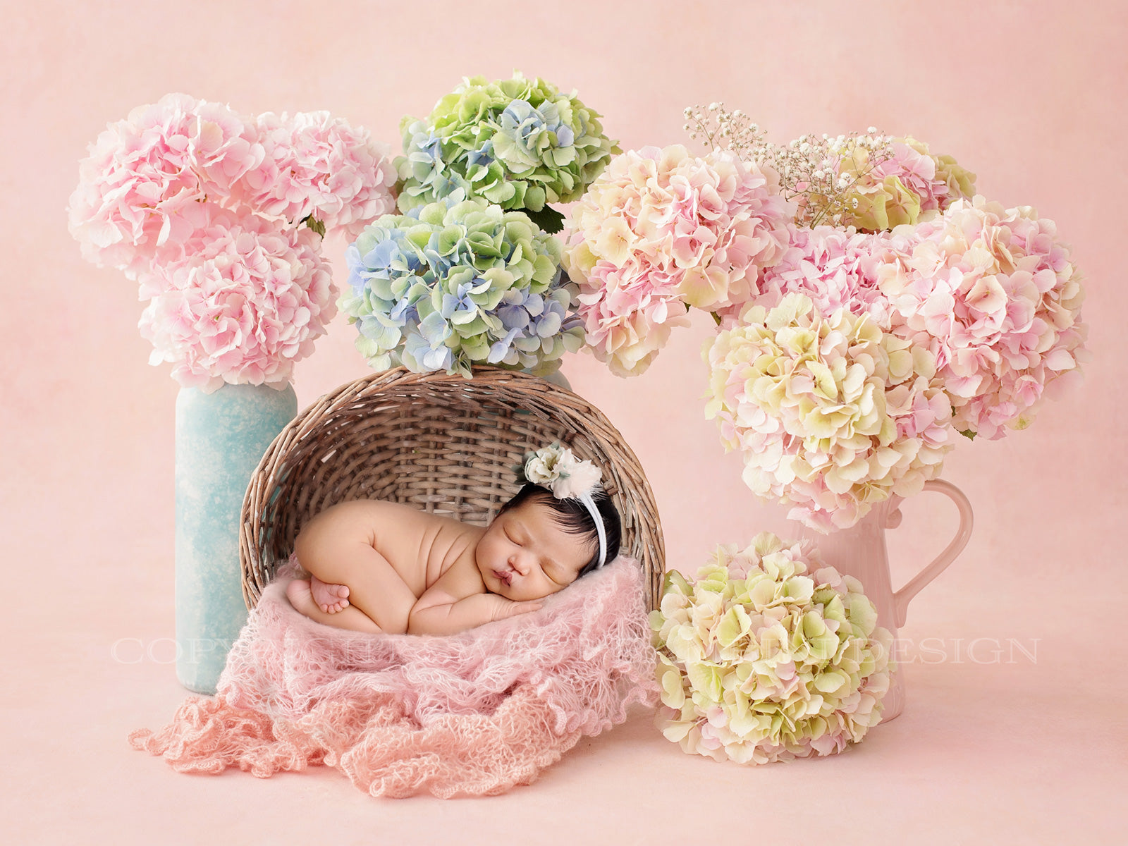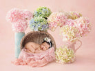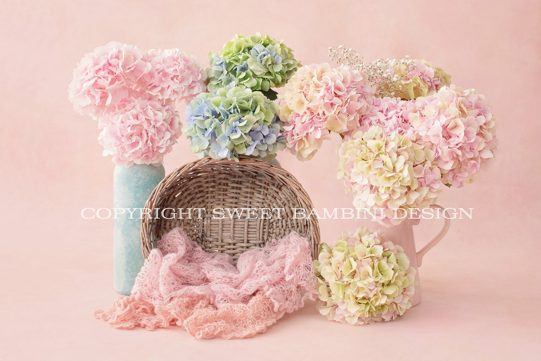 Newborn Photography Digital Backdrop - Gorgeous wicker basket surrounded by multi coloured fresh hydrangeas shot against a beautiful hand painted pink background.