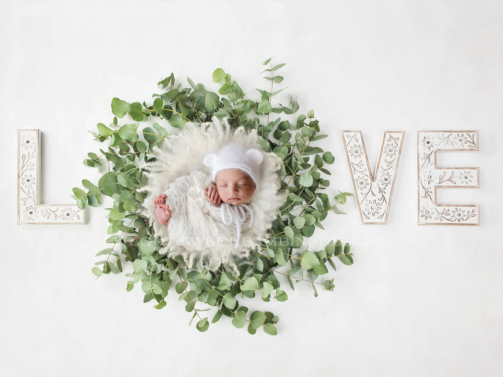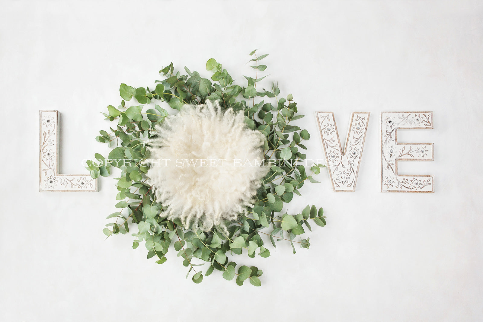 Newborn Photography Digital Photography Backdrop - Love spelled out in rustic wooden lettering, on a hand painted off white backdrop.