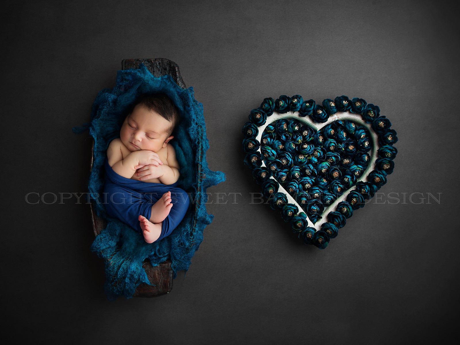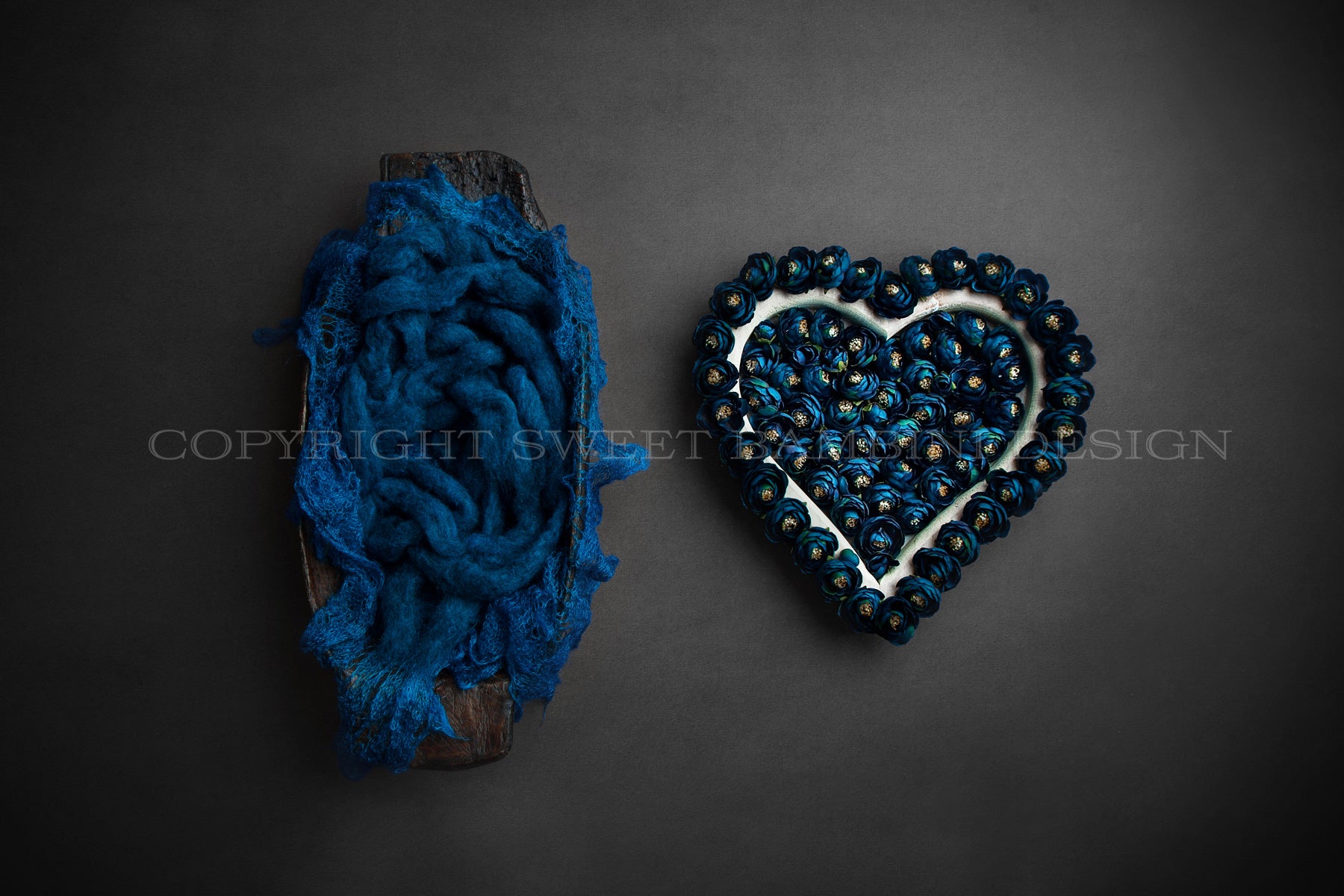 Newborn Photography Digital Photography Backdrop - Gorgeous oblong wooden bowl, with a dark blue insert, alongside a blue floral heart, shot from above on a dark grey textured background.