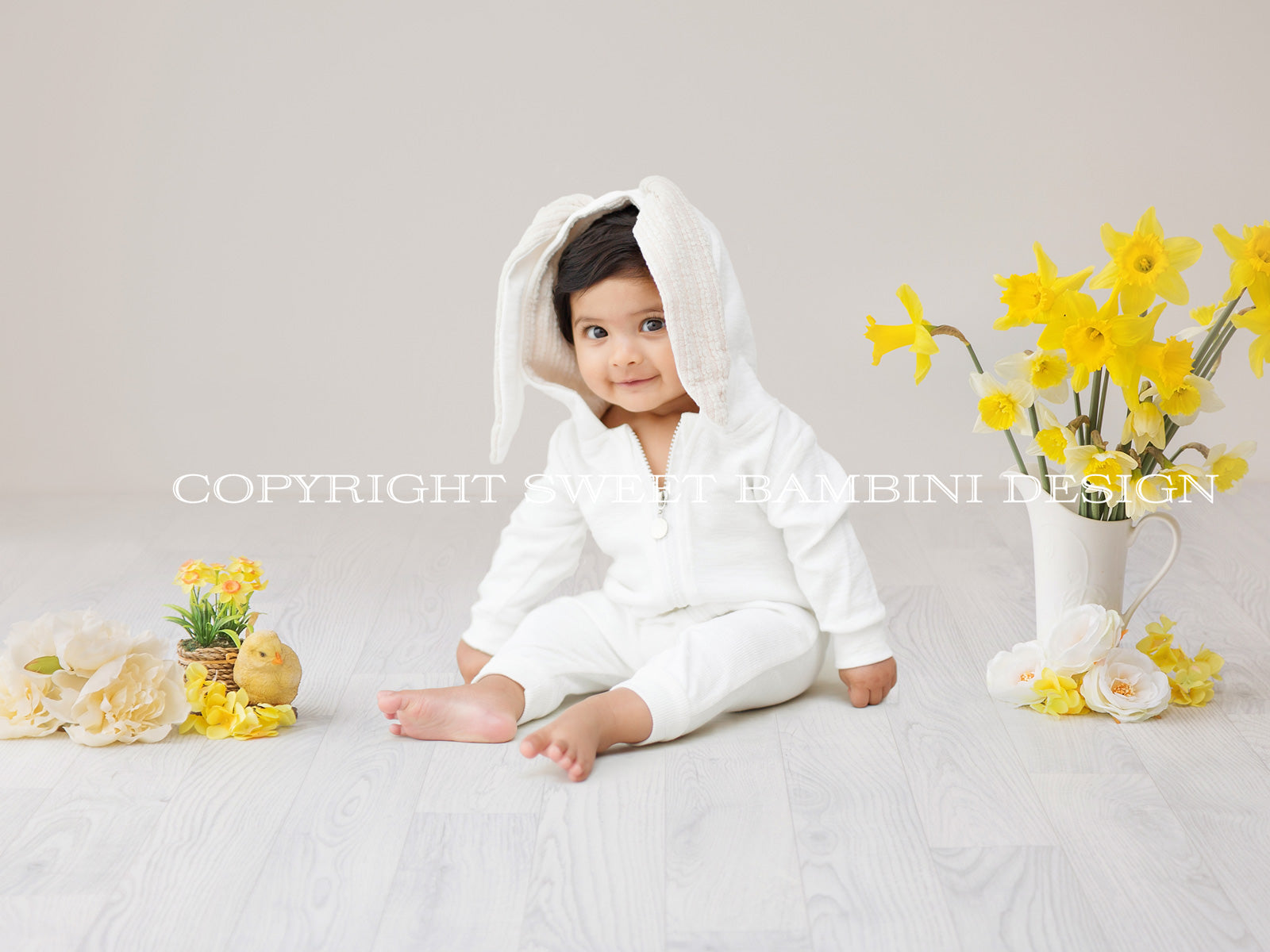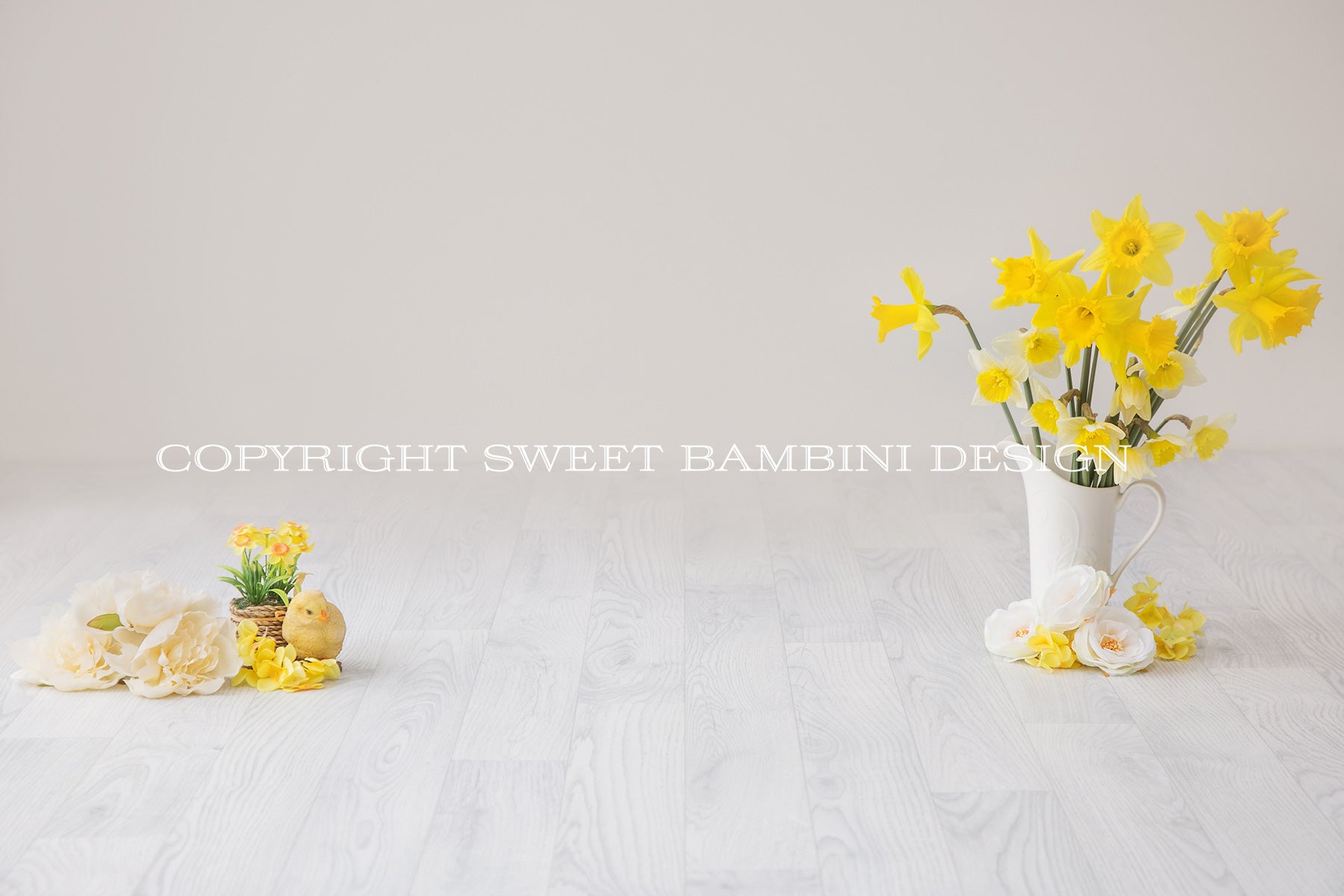 Sitter Digital Backdrop - Lovely Easter scene with fresh daffodils shot on an off white wood effect floor & background.
