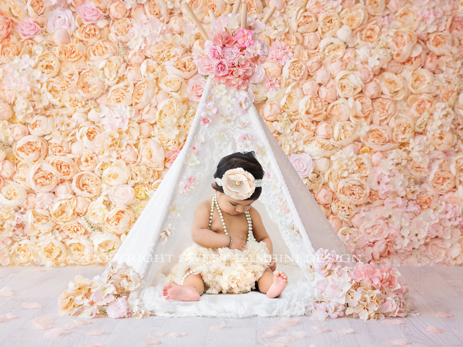 A beautiful little white teepee shot against a lovely handmade peachy flower wall. Perfect for sitters.