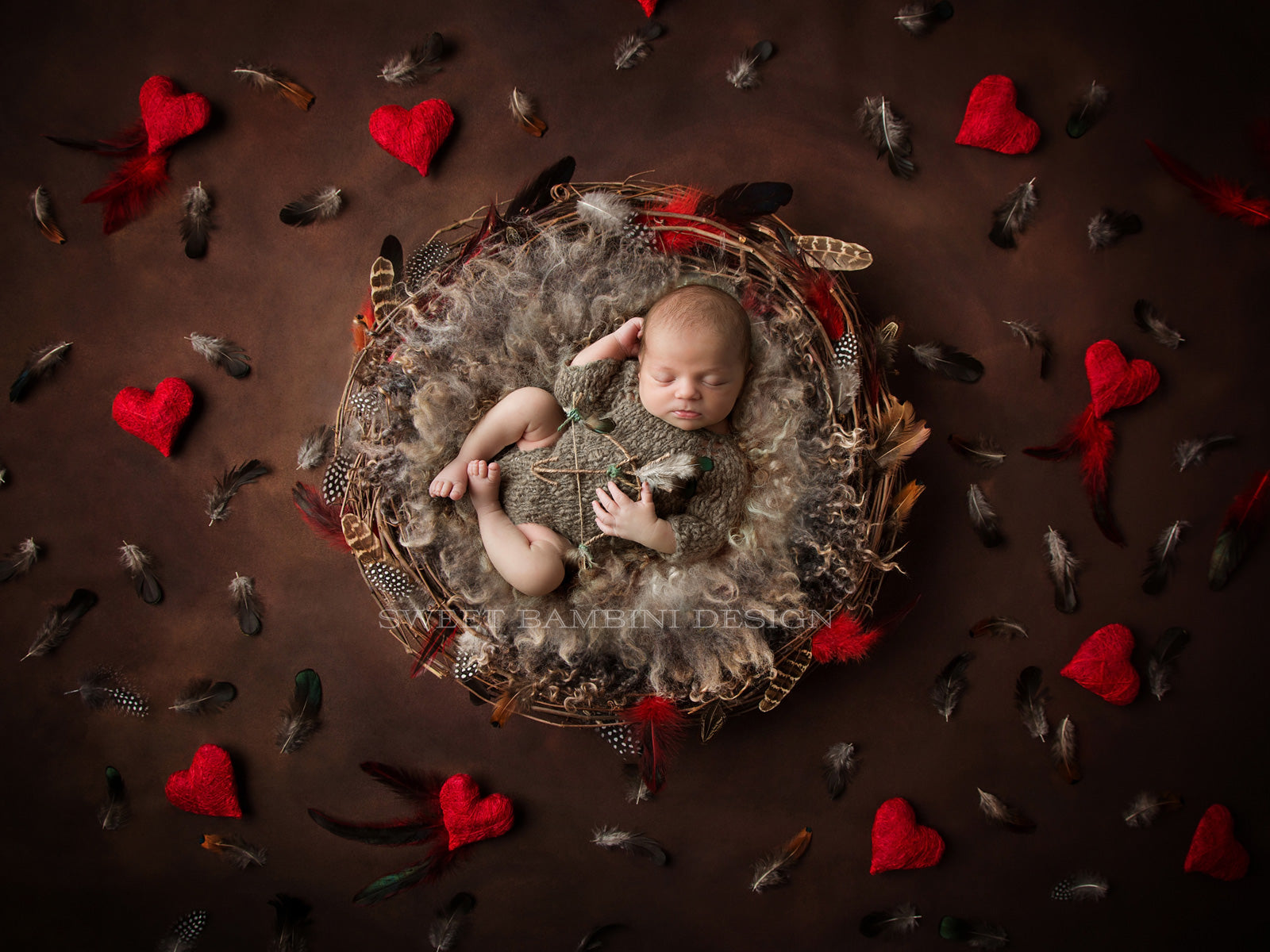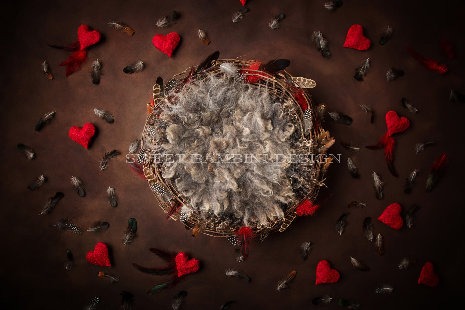 Newborn Photography Digital Photography Backdrop - lovely natural feather nest, on deep brown hand painted background (textured), decorated with feathers and little red hearts.