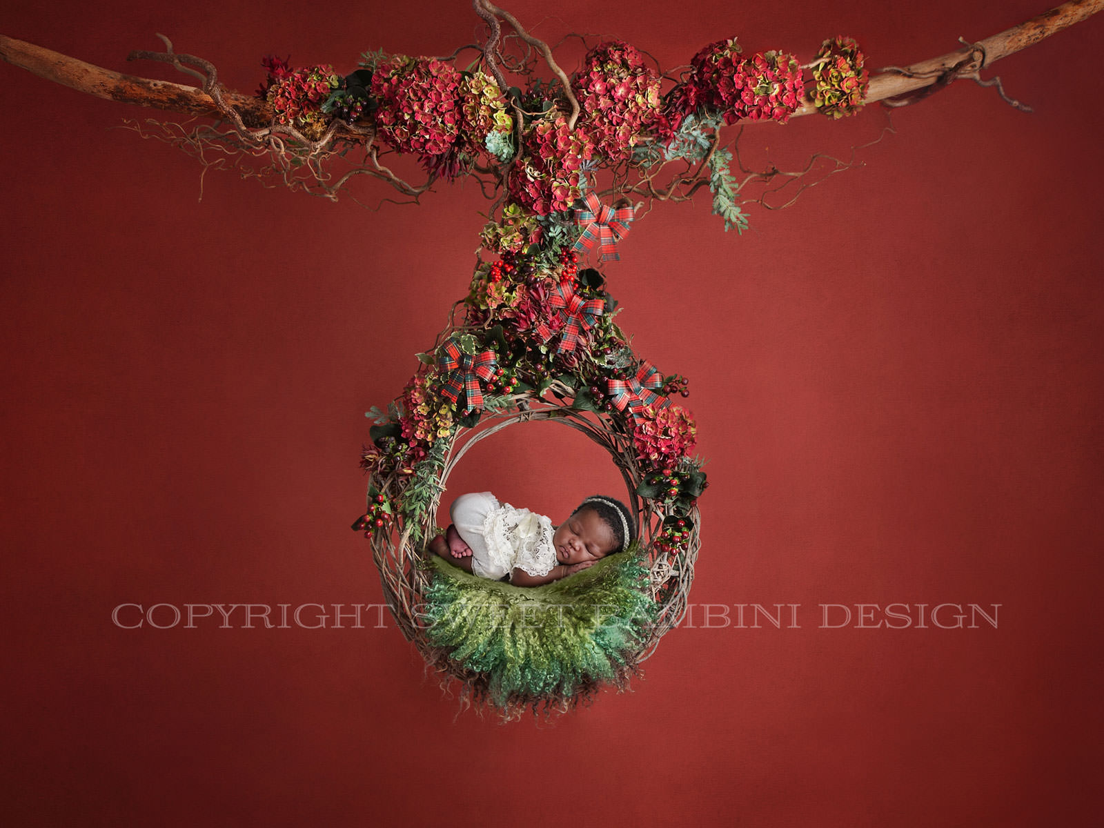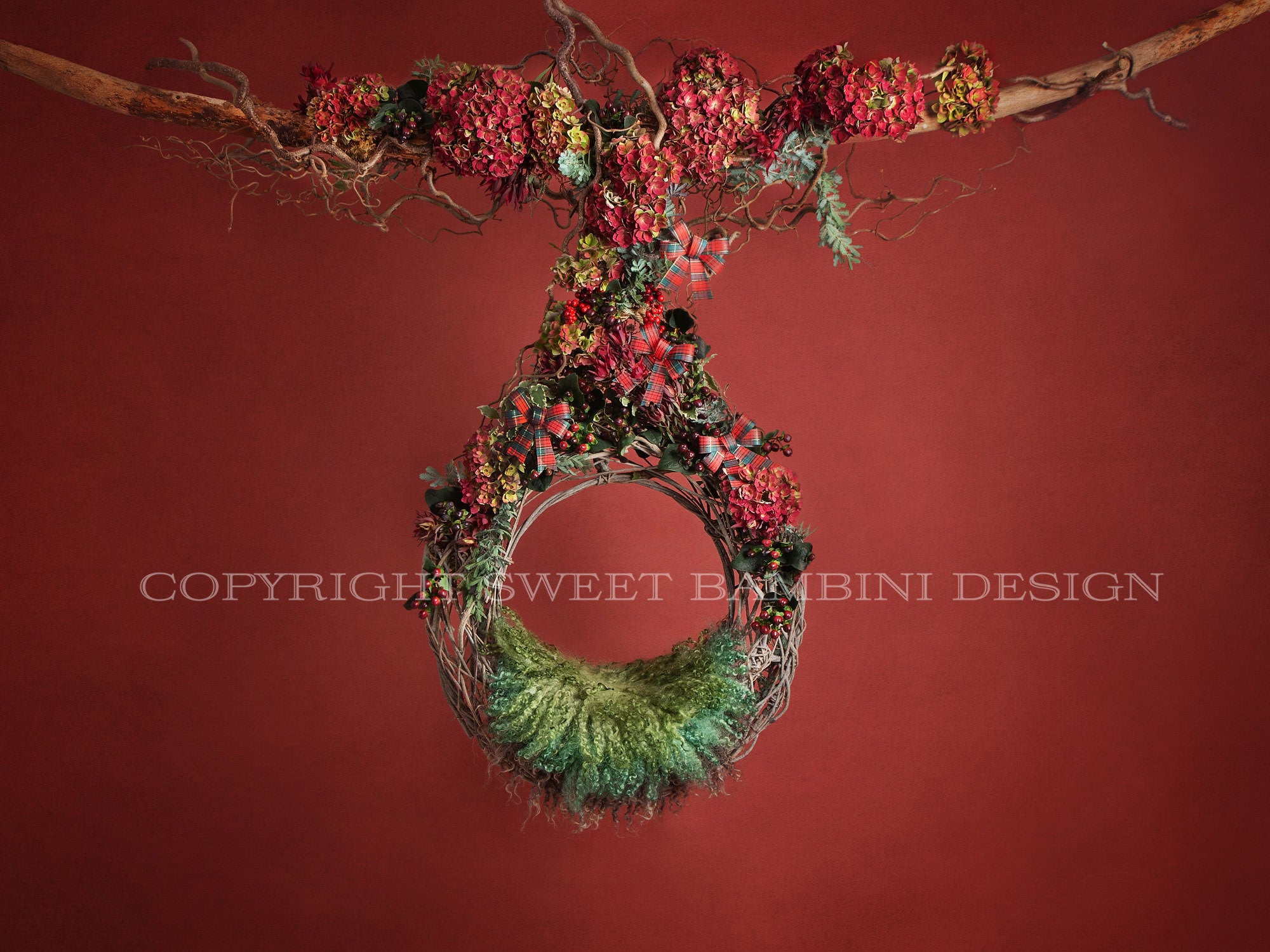 Newborn Digital Backdrop - Gorgeous hanging swing wreath decorated with an abundance of fresh florals - berries, hydrangeas & other fresh plants. Shot on a slightly textured rich red backdrop - perfect for autumn and Christmas sessions. This backdrop also has some lovely tartan bows.
