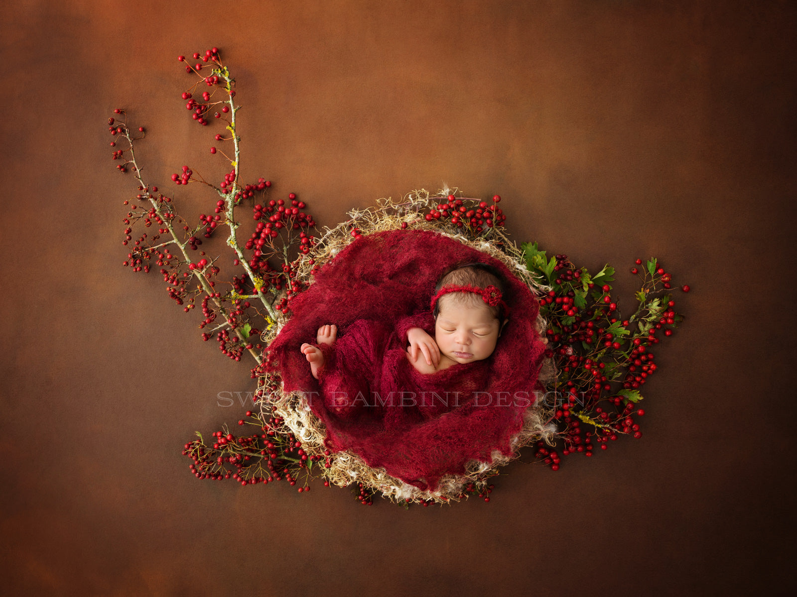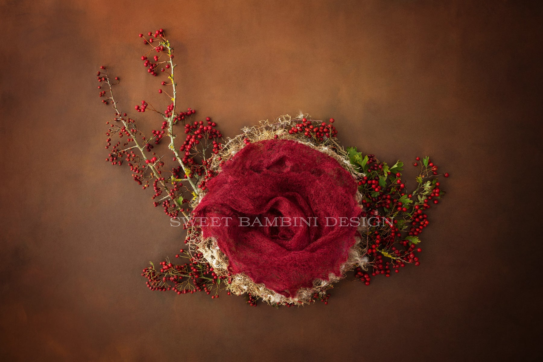 Newborn Photography Digital Backdrop for boys or girls - Natural nest with fresh red berries, shot on a rich chocolate brown background