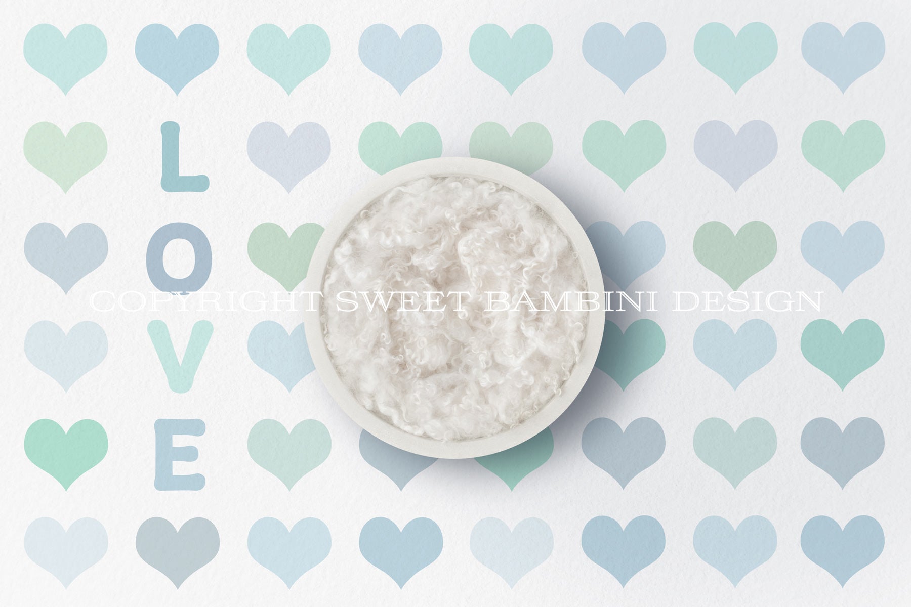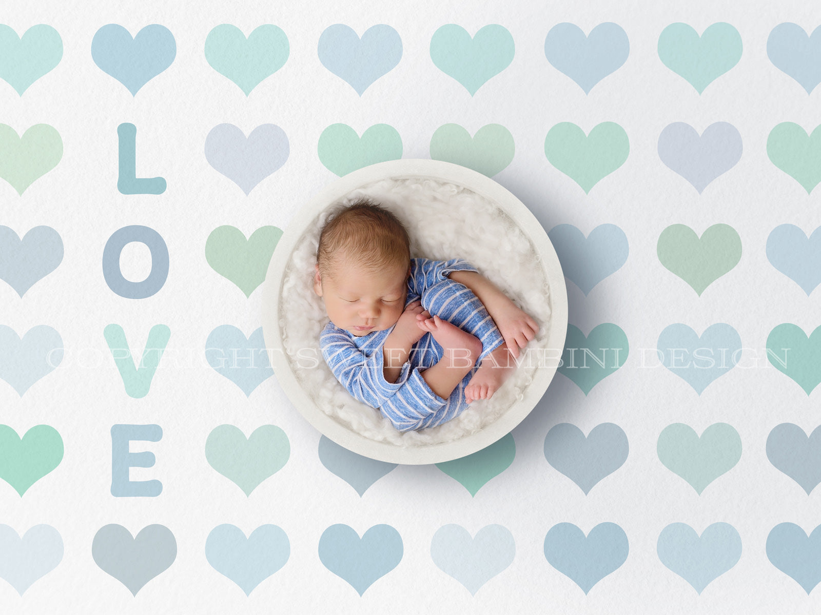 Newborn Digital Background - Watercolour Effect Green and Blue LOVE Hearts, Instant Download, Ready for you to Edit
