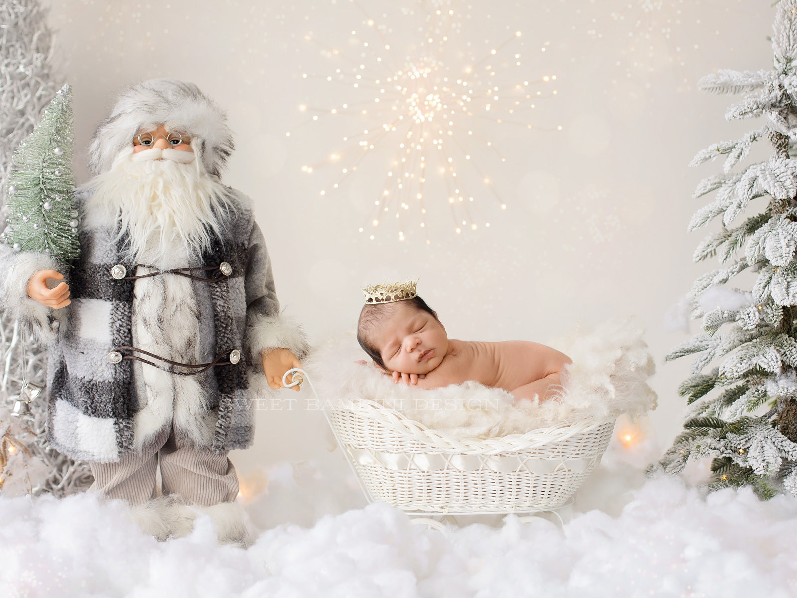 Newborn Photography Digital Photography Backdrop - Lovely little Christmas scene, with a gorgeous little white pram, Christmas Trees and a grey Santa.