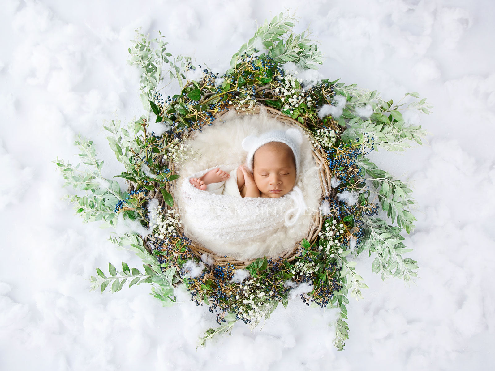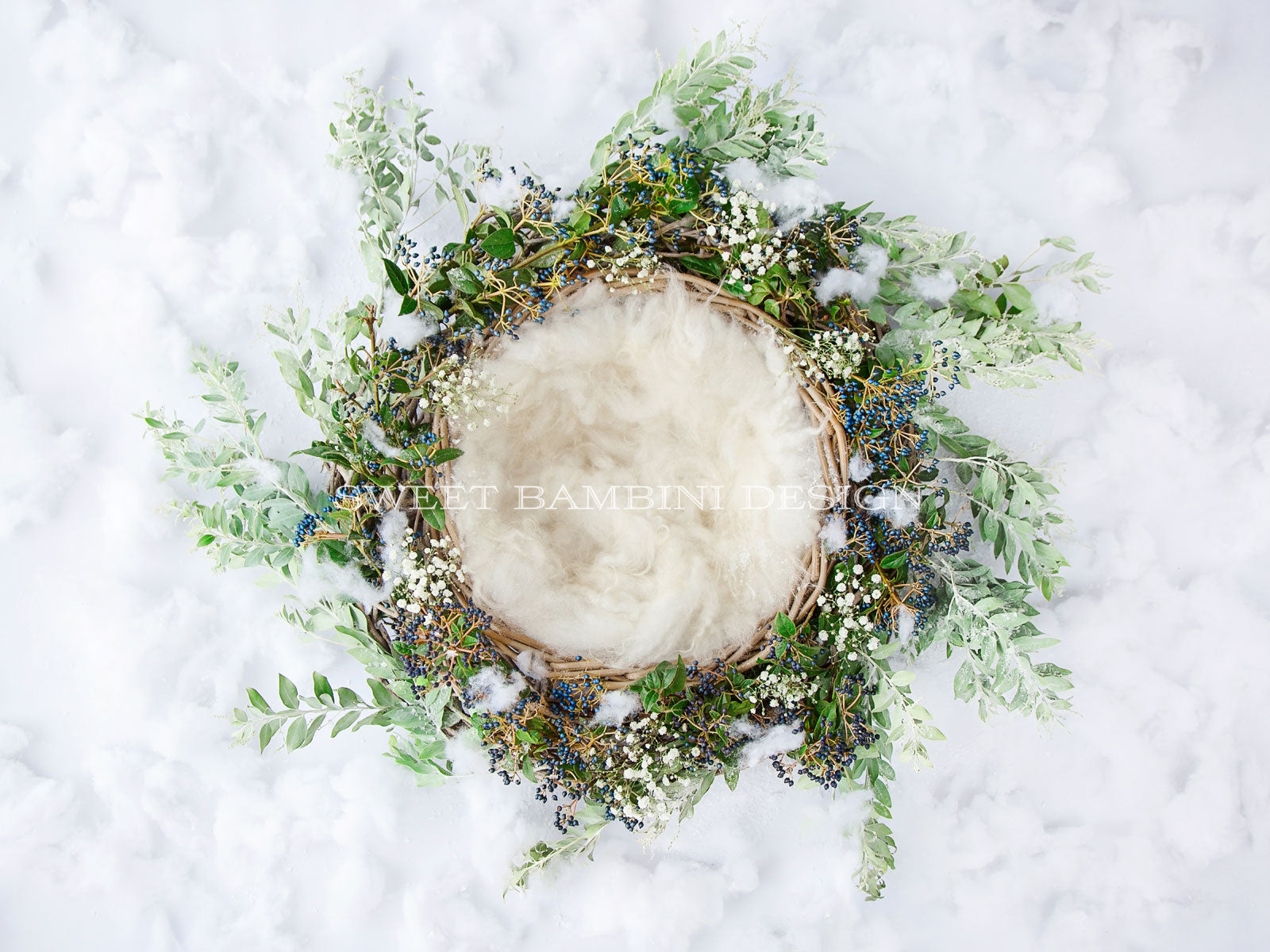 Newborn Photography Digital Photography Backdrop - beautiful nest in a middle of a snow like background. Made entirely with fresh flowers and berries.