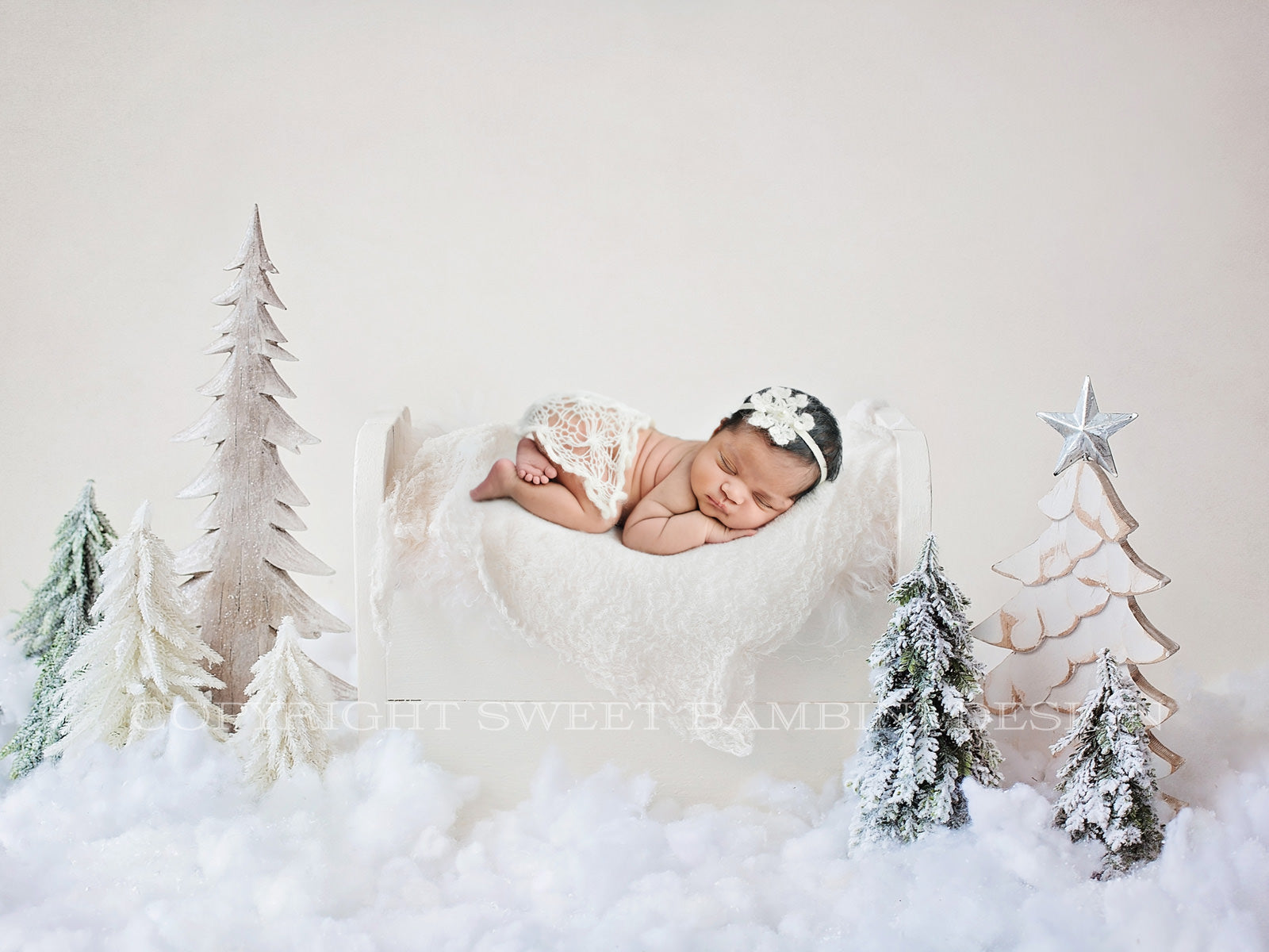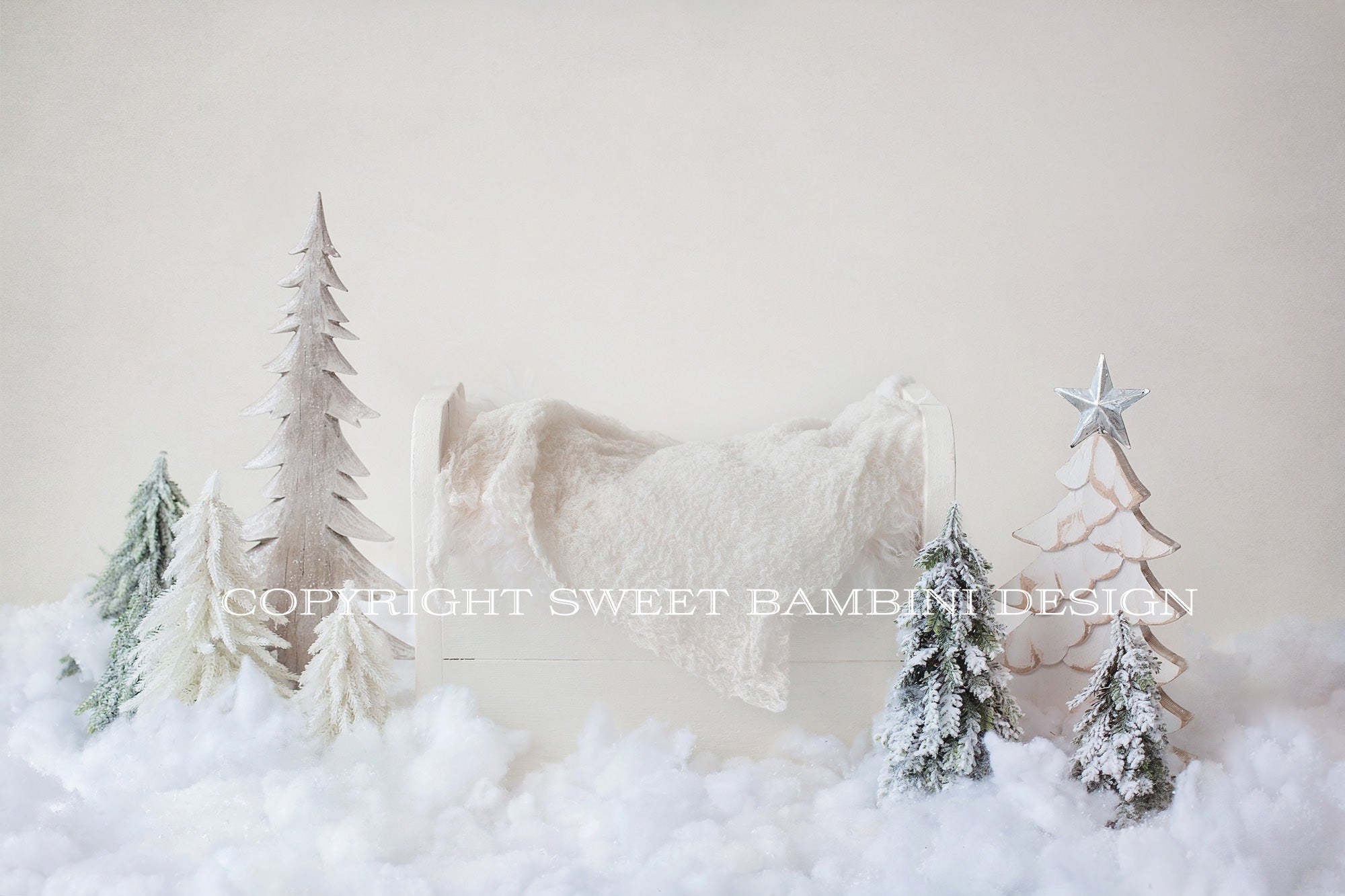 Christmas Newborn Digital Backdrop - Little white bed, set amongst snowy Christmas trees shot on a cream background.
