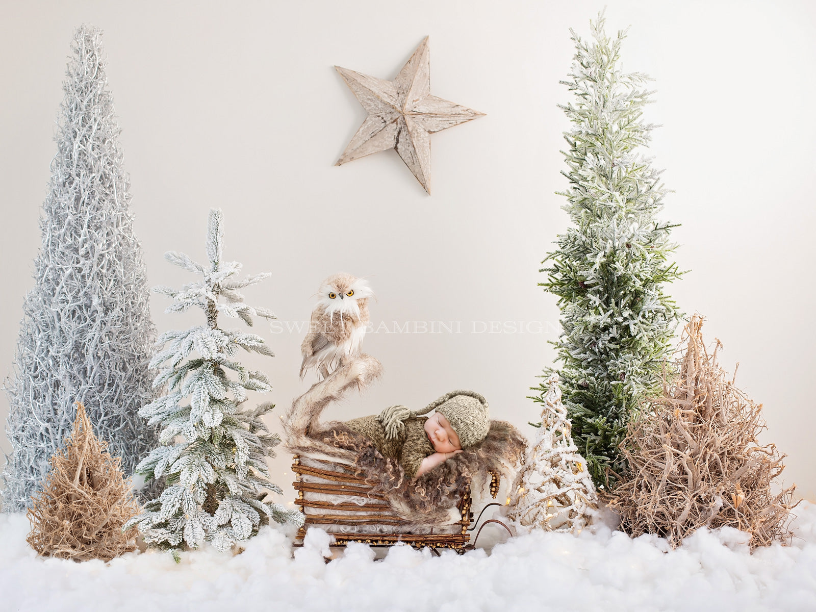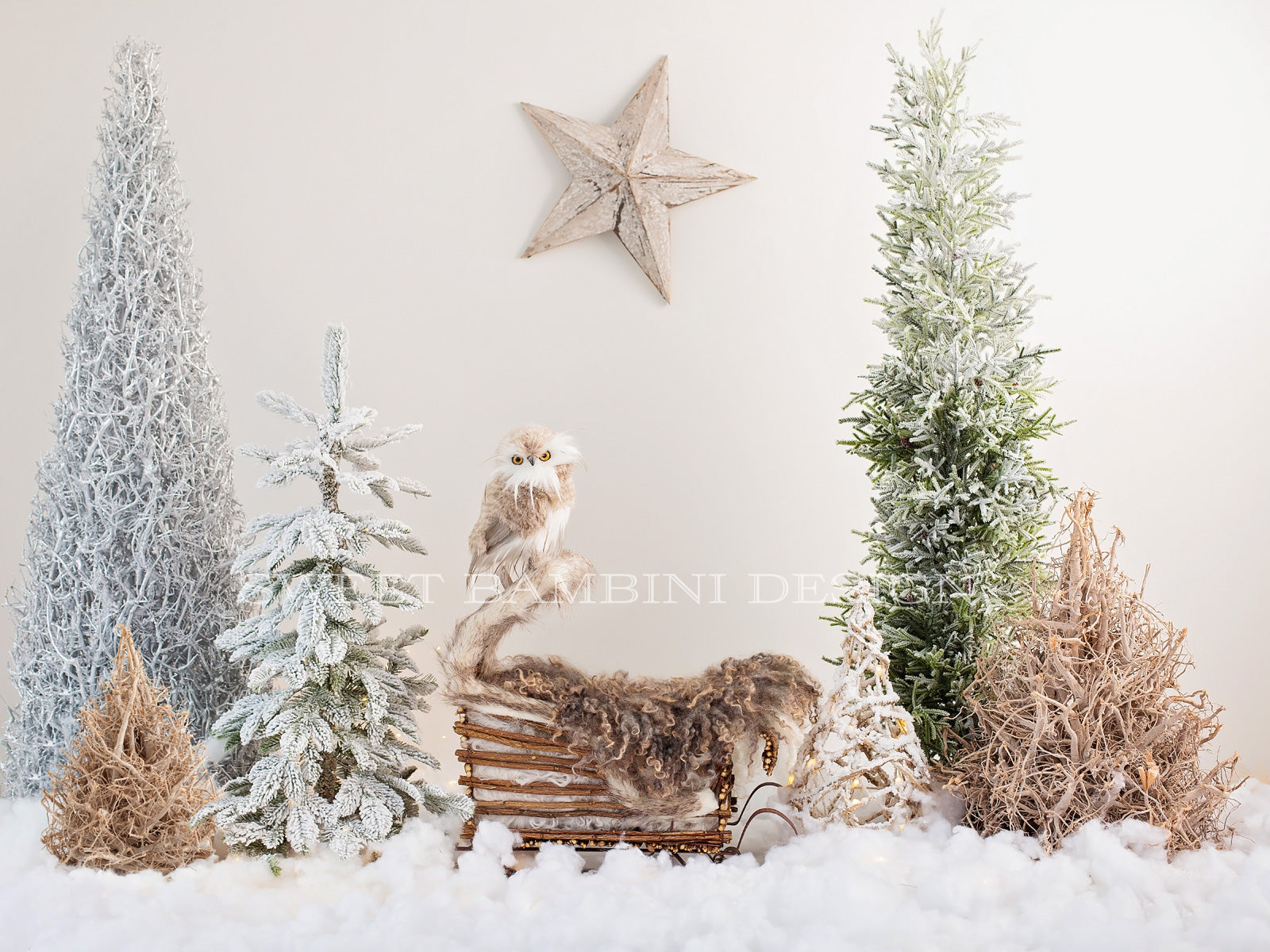 Newborn Photography Digital Photography Backdrop - Lovely little Christmas scene, with a gorgeous little wooden sled, Christmas trees and a little winter owl, perfect for little boys or girls.