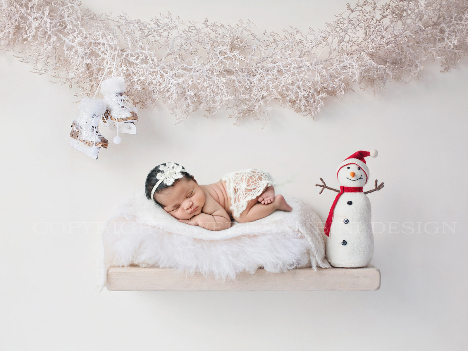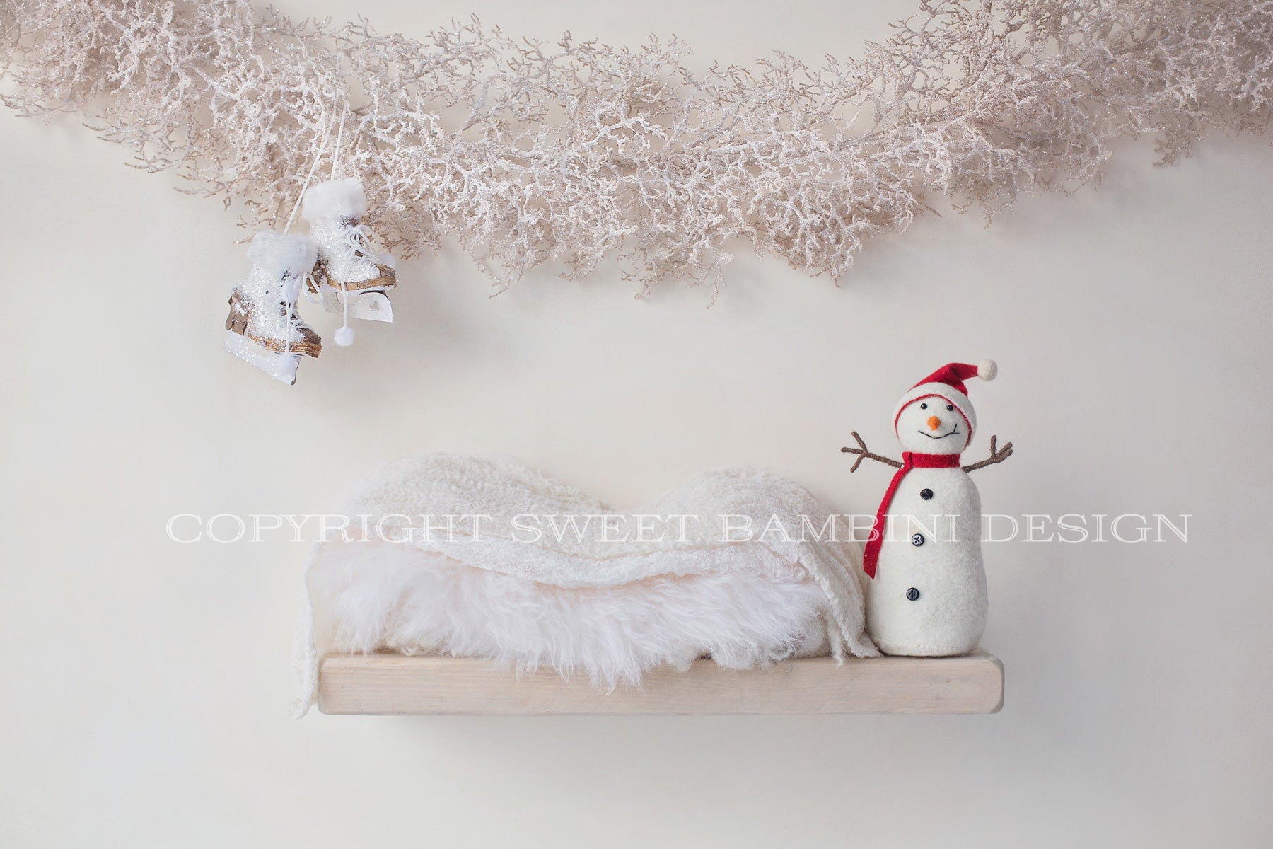 Newborn Digital Backdrop for Christmas - Chunky cream shelf with cute snowman, ice skates and a Christmas garland