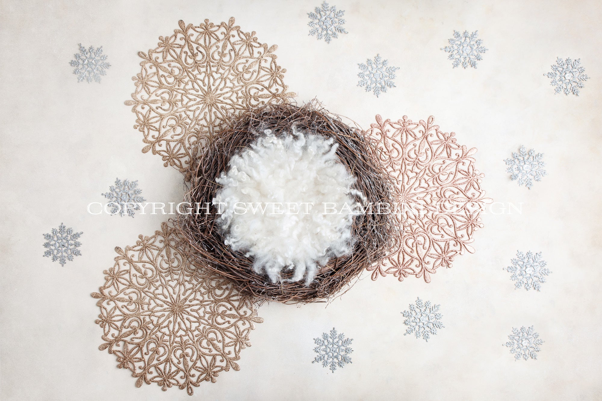 Newborn Digital Backdrop - Lovely little nest, surrounded by silver & gold "snowflakes" shot on a lightly textured creamy background.