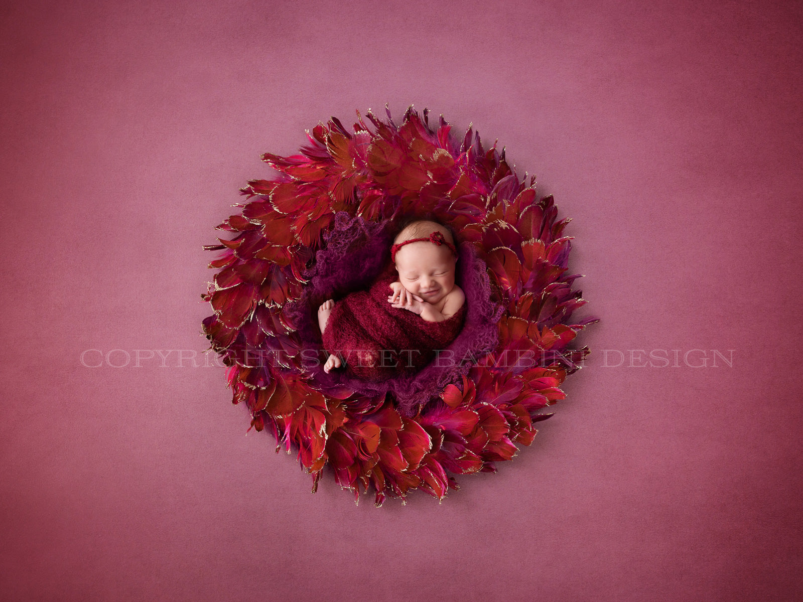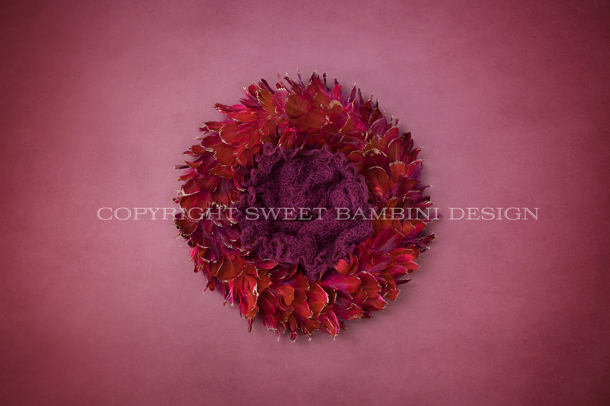 Newborn Photography Digital Backdrop - Beautiful feather nest in rich shades of red shot against a lovely hand painted, slightly textured mulberry backdrop. The feathers have gold details on the ends too. Perfect for Autumn or Christmas shoots.