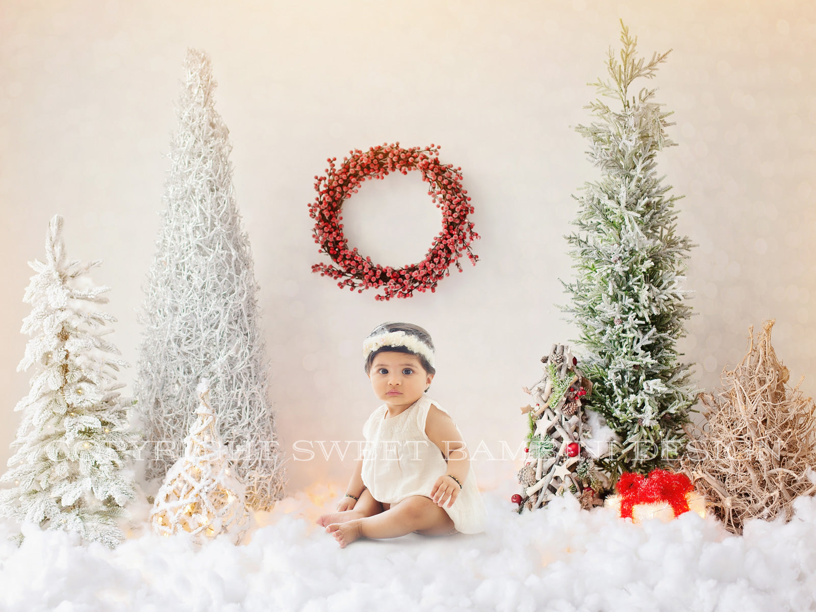Christmas Digital Photography Backdrop for sitters - Lovely little Christmas scene, with snowy trees and Christmas Wreath perfect for boys or girls.