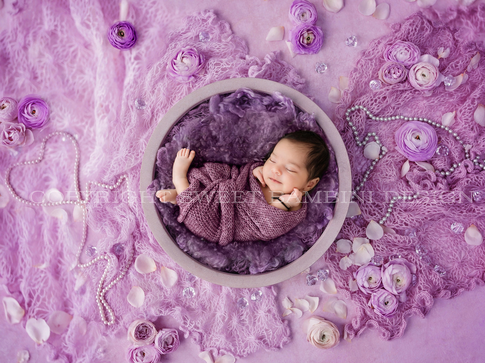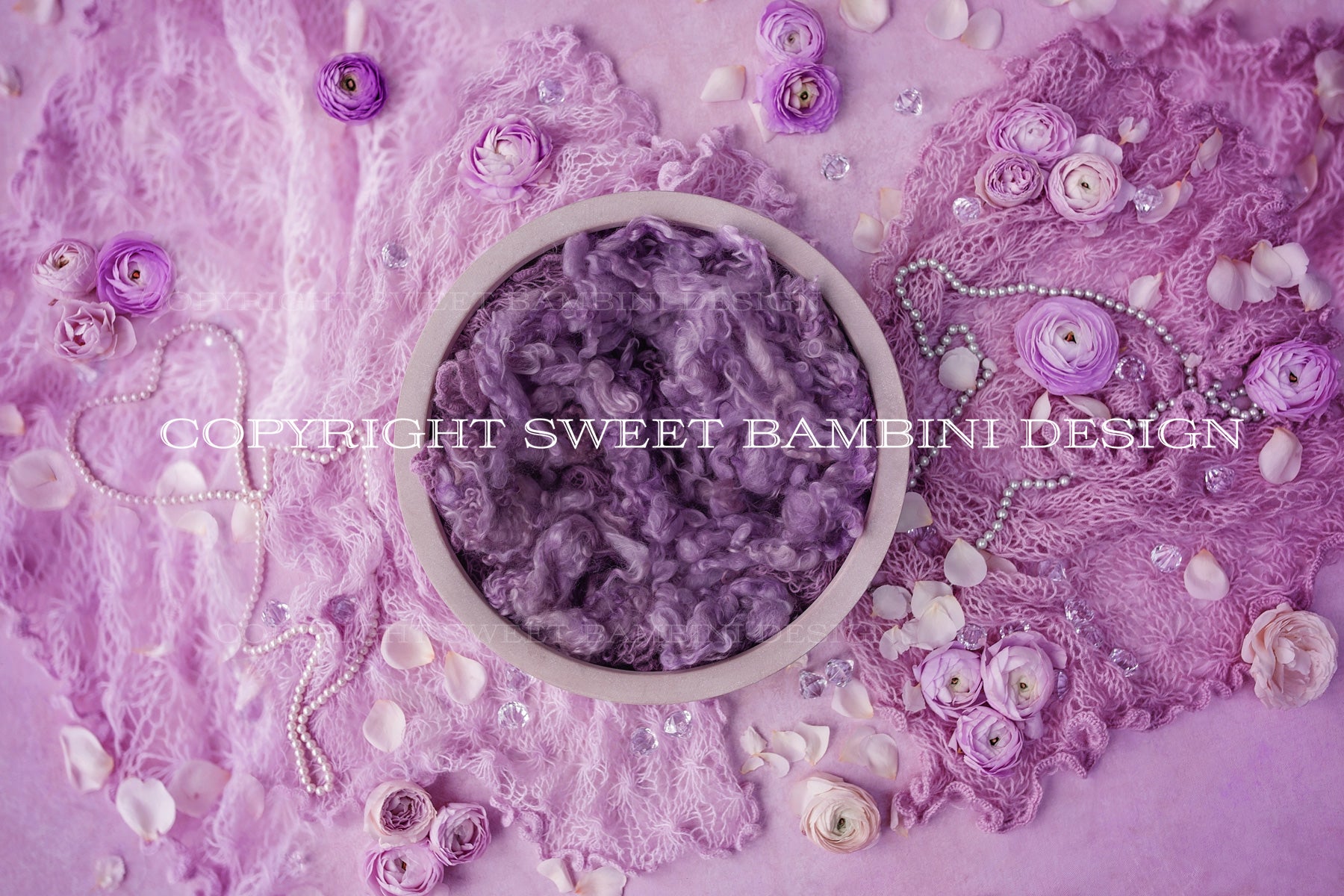 Digital Backdrop for newborns - Bowl with a purple middle, decorated with purple flowers, pearls and crystals