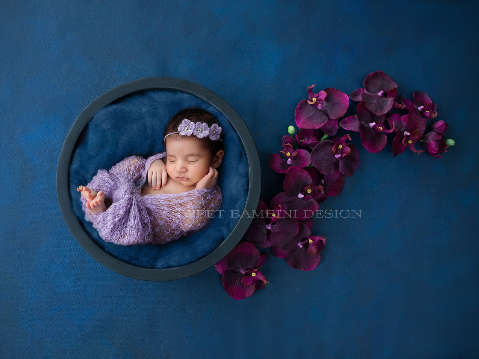 Unisex Newborn Digital Background - Blue nest, with mulberry/purple/very dark pink orchids