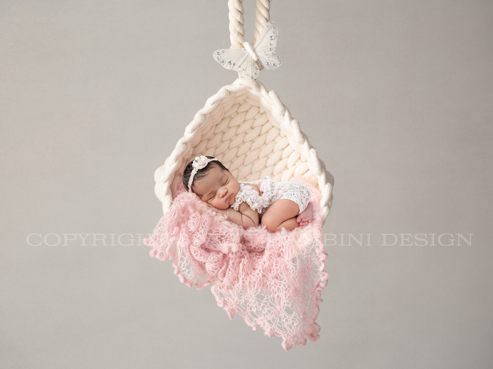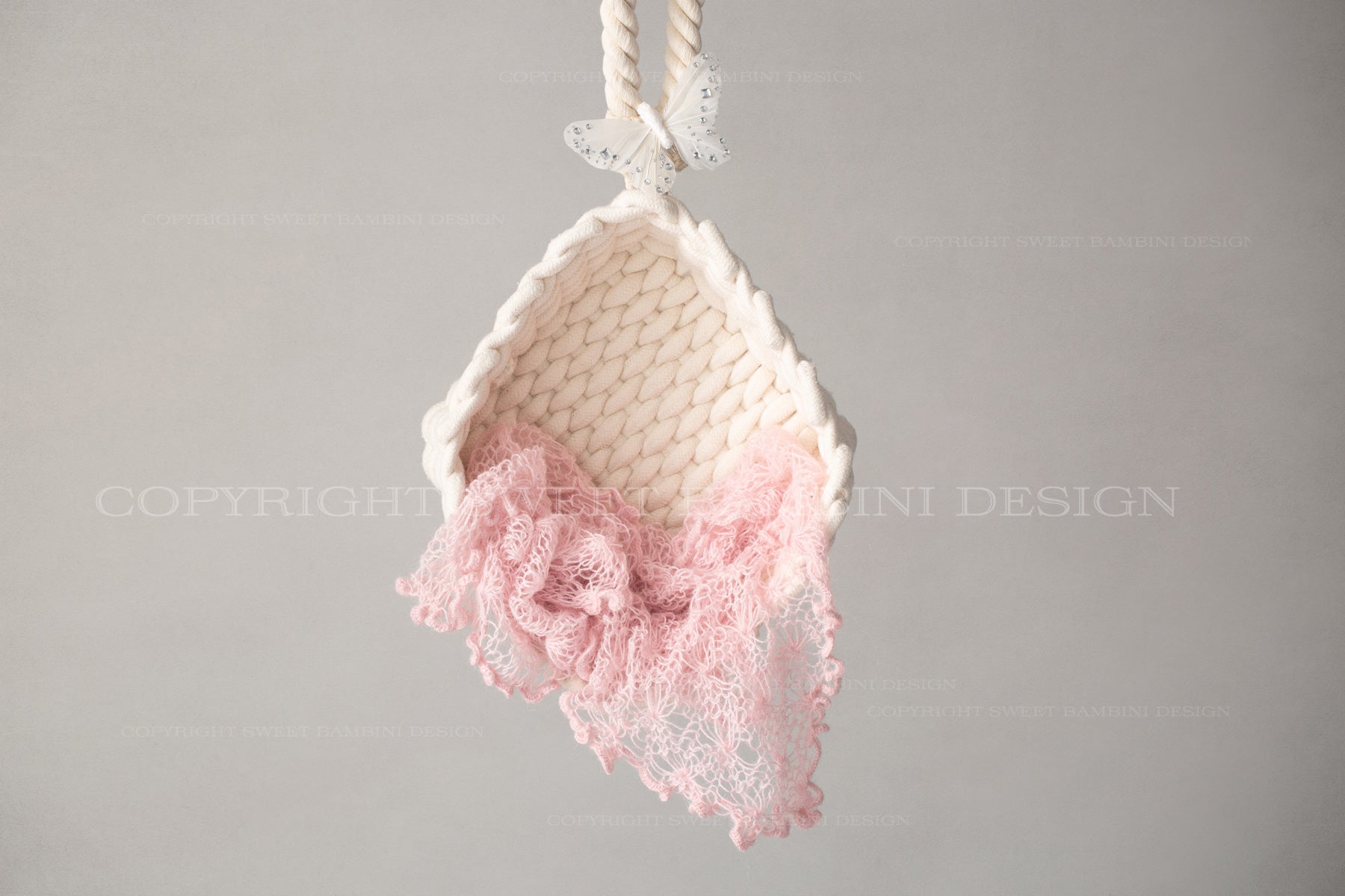 Newborn Digital Backdrop - Lovely little white hanging basket with a pink wrap and pretty white butterfly.