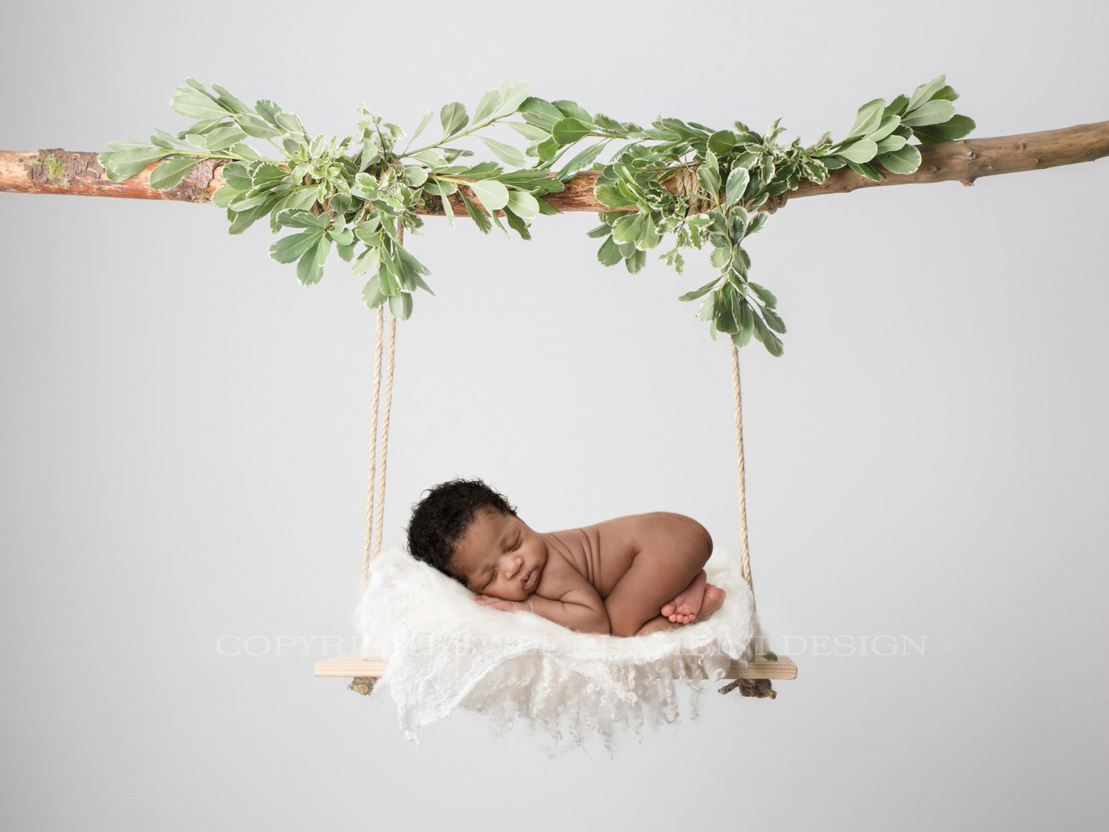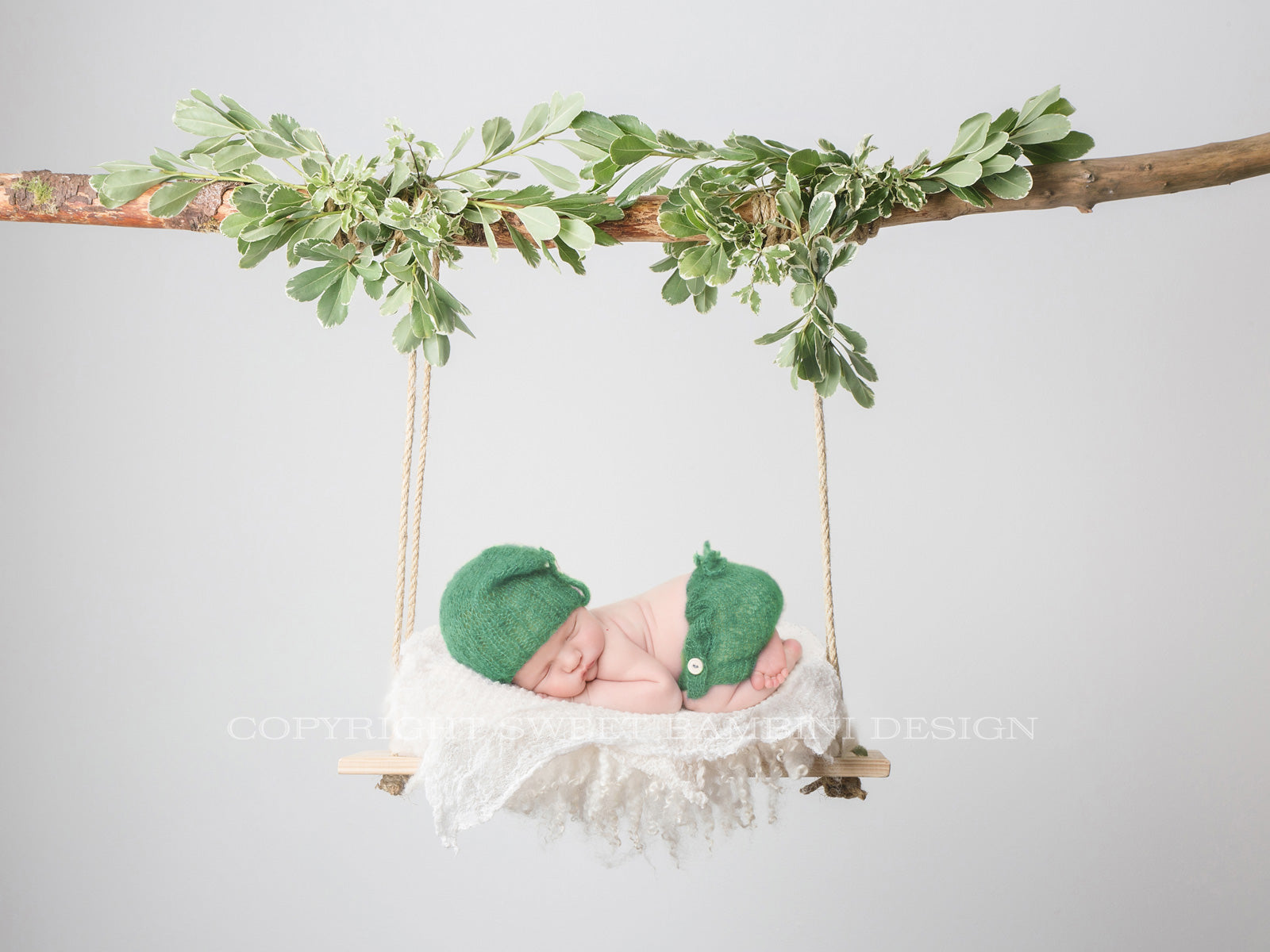 Newborn Digital Backdrop - Beautifully natural wooden swing decorated with fresh green leaves. Simple, timeless & unisex - perfect for those that prefer a more minimalistic feel to their images.