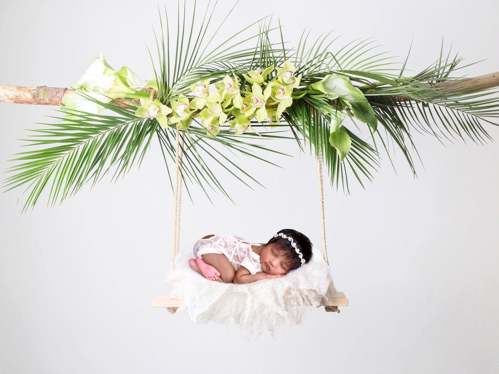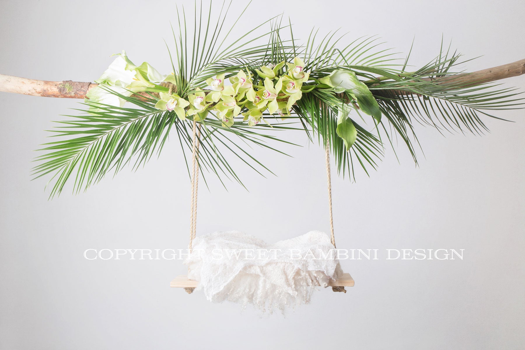 Newborn Digital Backdrop - Lovely natural wooden swing decorated with fresh orchids and palm leaves. A lovely tropical feel!