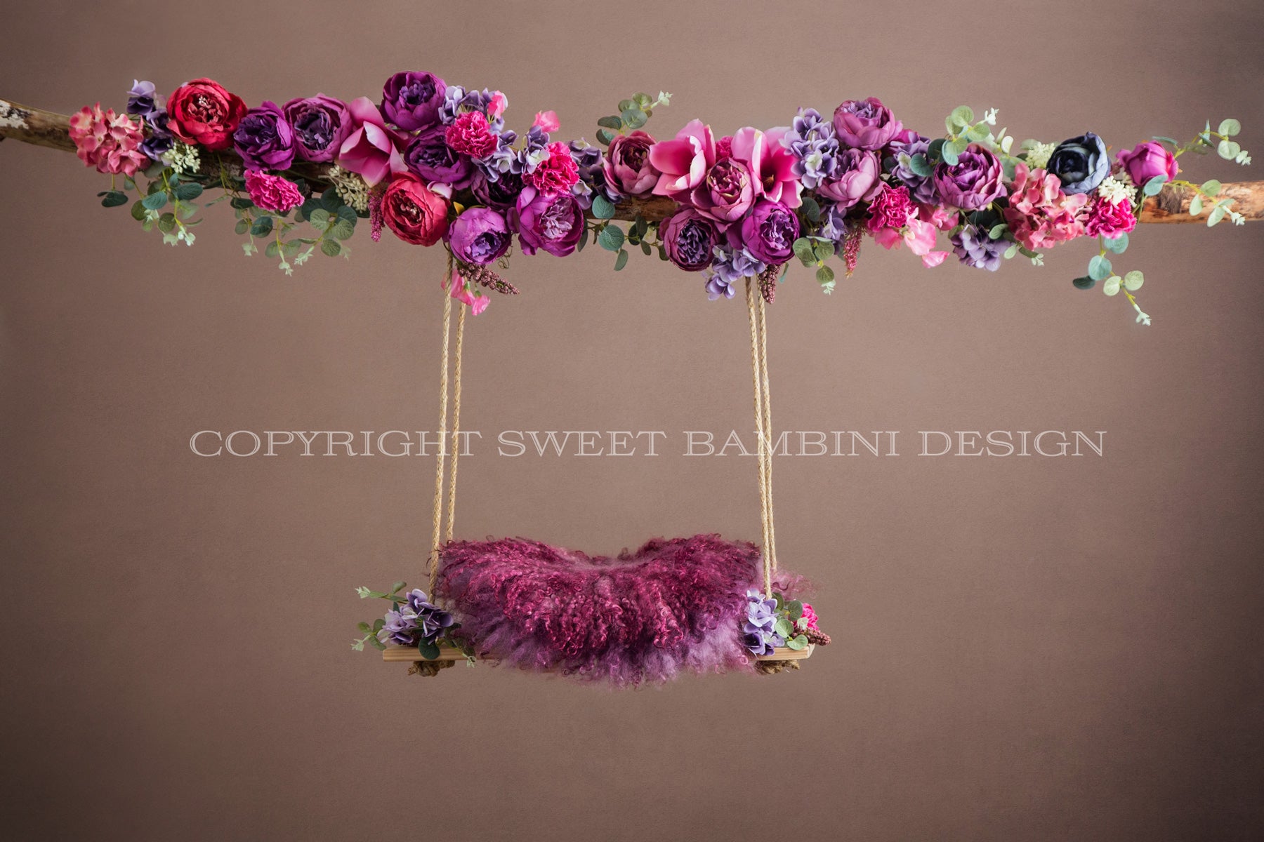 Newborn Photography Digital Backdrop - Lovely natural wooden swing decorated with multi coloured peonies, moss and eucalyptus, shot on a rich textures chocolate background. Gorgeous mix of deep, rich colours.