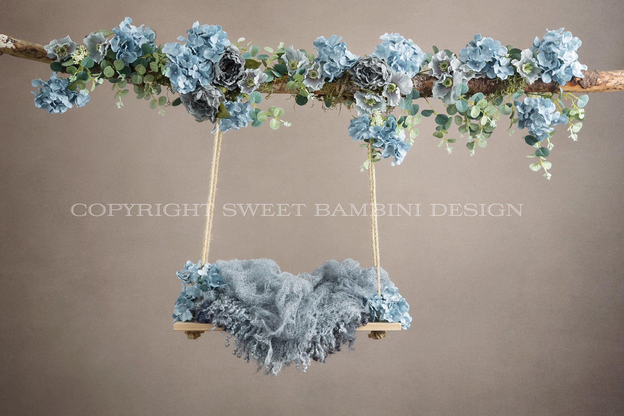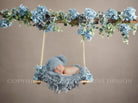 Newborn Floral Swing Digital Backdrop - Wooden swing decorated with blue flowers, moss & eucalyptus