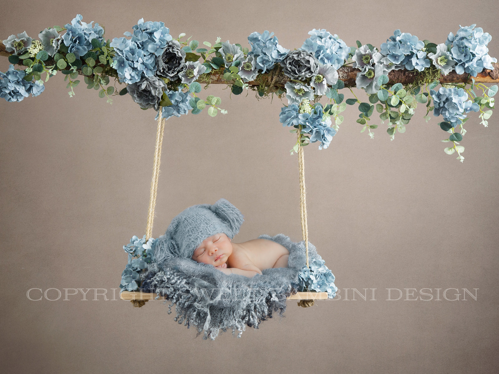 Newborn Photography Digital Backdrop - Lovely natural wooden swing decorated with moss, eucalyptus, decorated blue peonies, poppies and hydrangeas. Beautifully subtle colour palette. Shot against a lovely textured light chocolate painted wall.