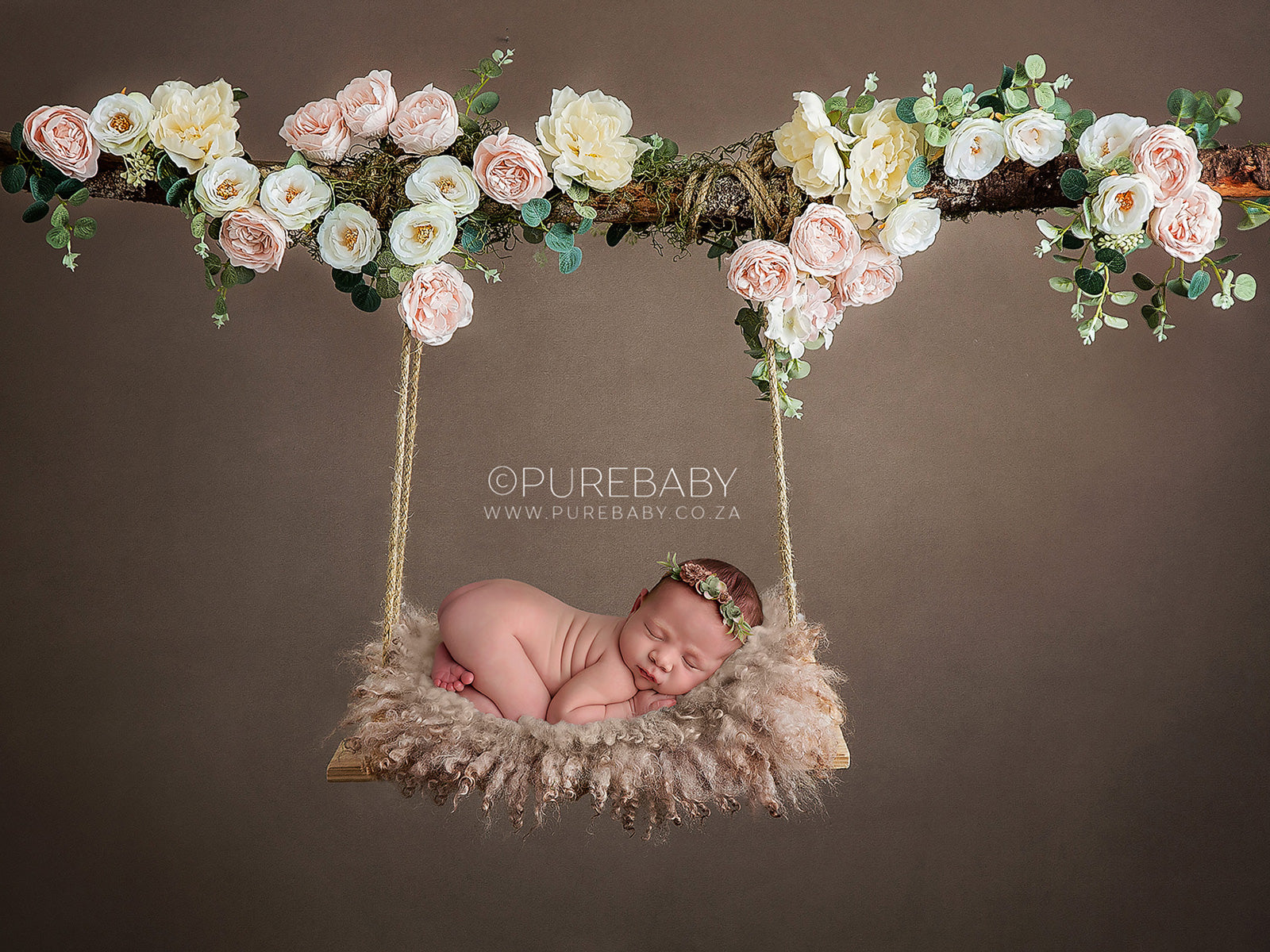 Newborn Photography Digital Backdrop - Lovely natural wooden swing decorated with moss, eucalyptus, and pink and white flowers. Shot against a lovely textured light chocolate painted wall.