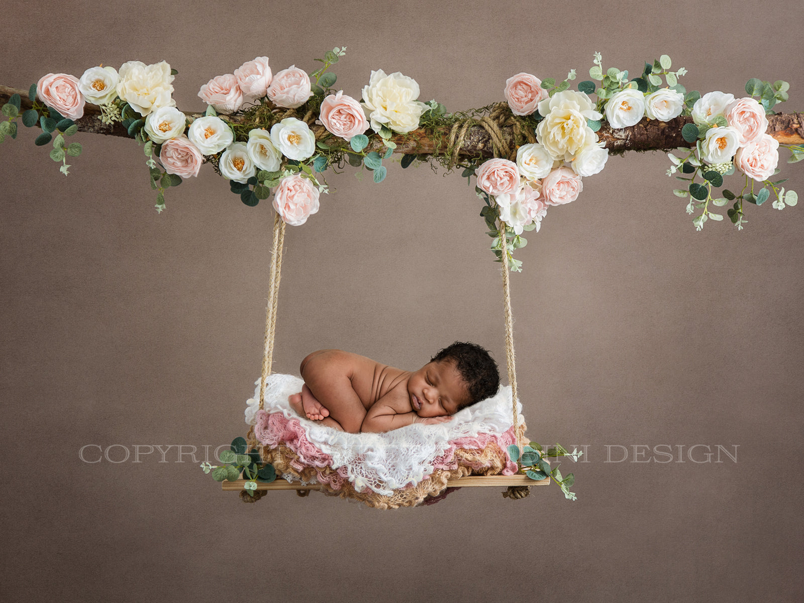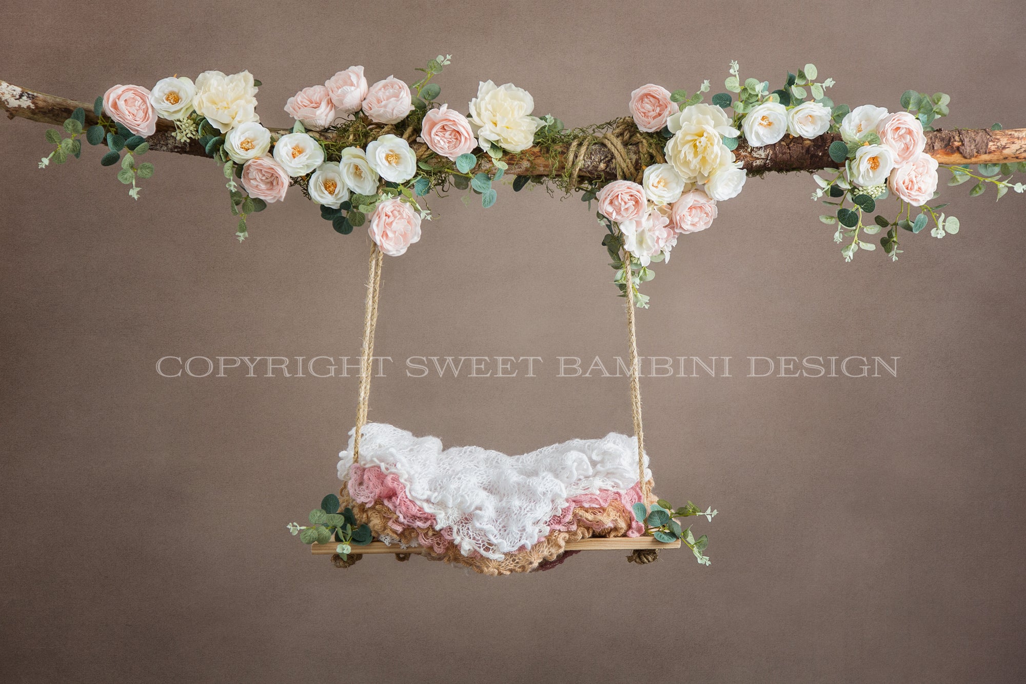 Newborn Floral Swing Digital Backdrop - Wooden swing decorated with roses, moss & eucalyptus