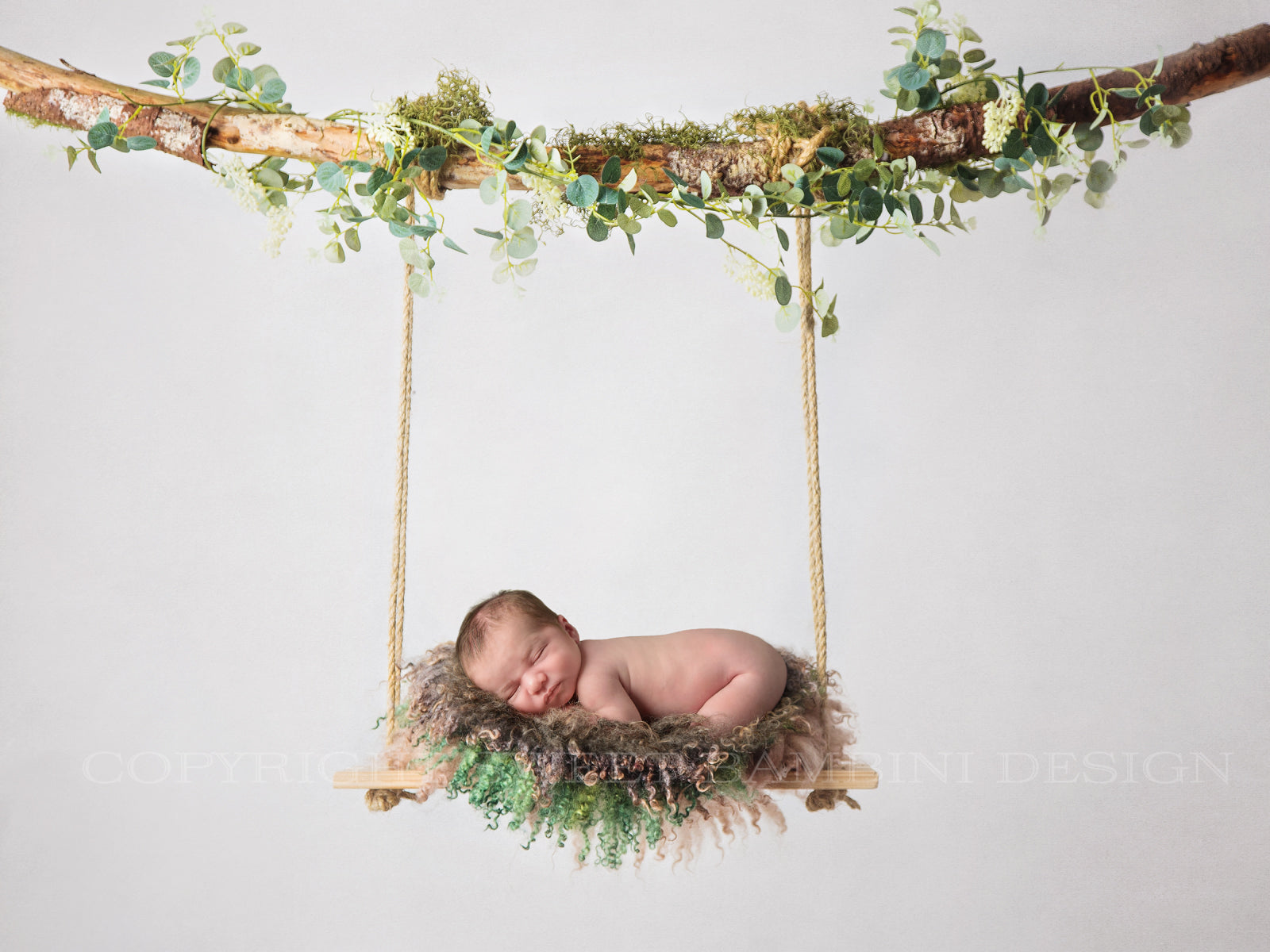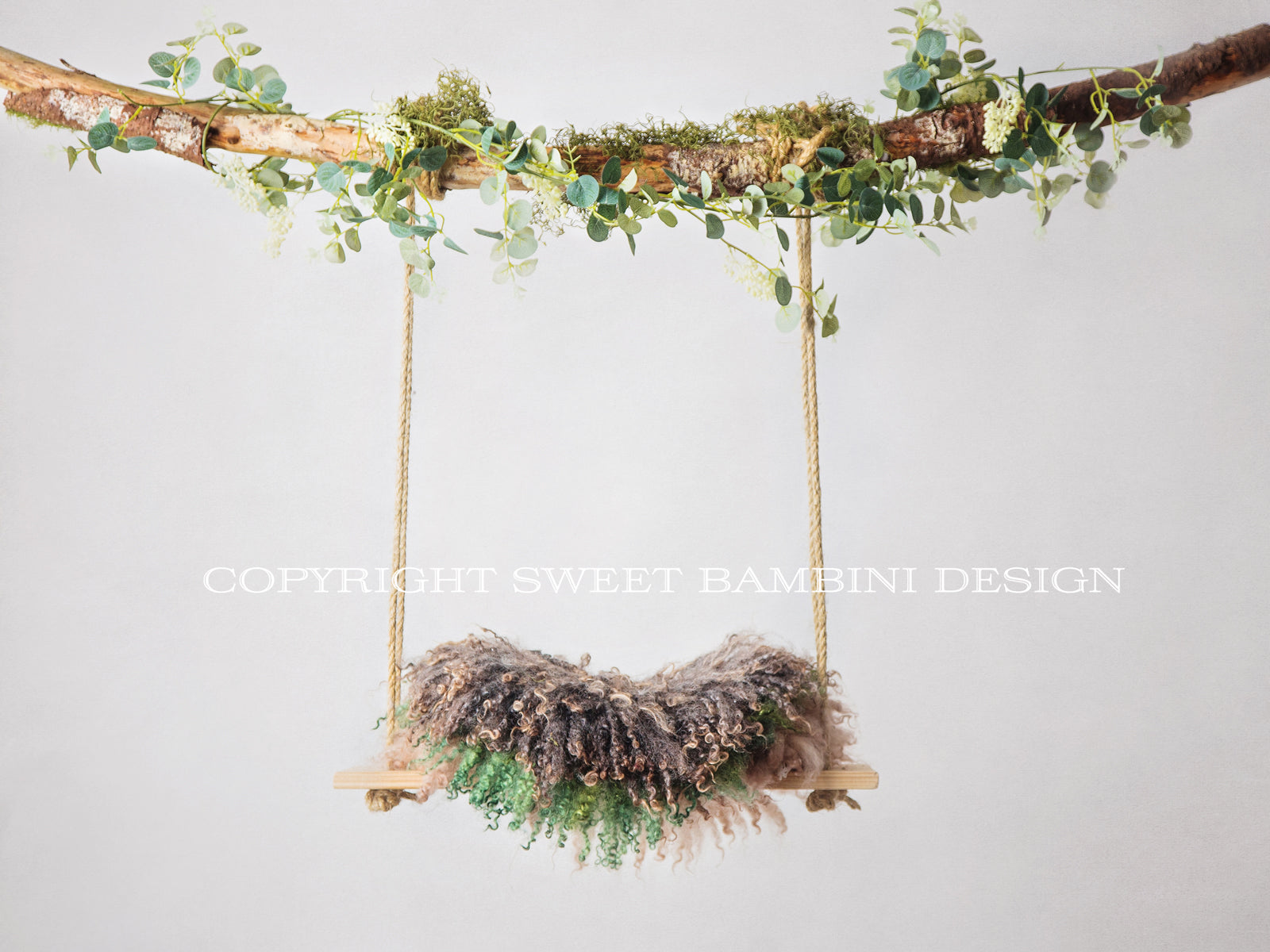 Newborn Photography Digital Backdrop - Lovely natural wooden swing decorated with moss and eucalyptus. Beautifully simple and organic. Baby not included!