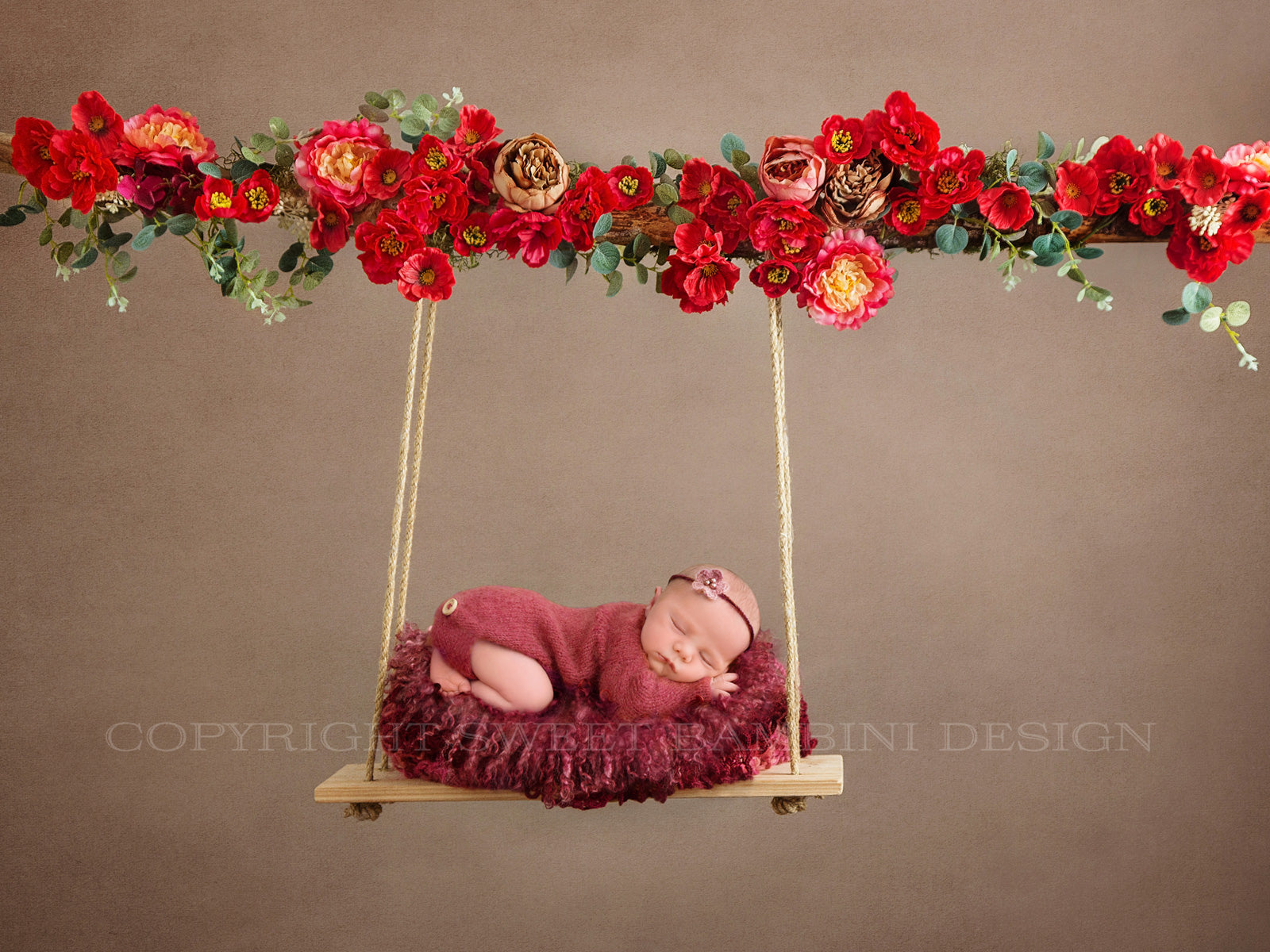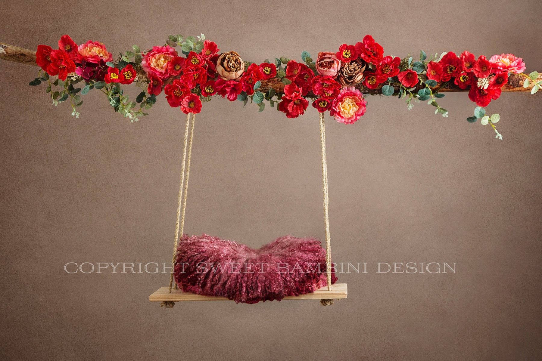 Newborn digital swing - Mixed red poppies & a few peonies with some eucalyptus decorate this beautiful swing. Shot against a rich chocolate textured wall.