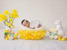 Newborn Digital Backdrop - Bright yellow nest with white wool insert, surrounded by Easter bits and pieces - shot on a off white floor & background.