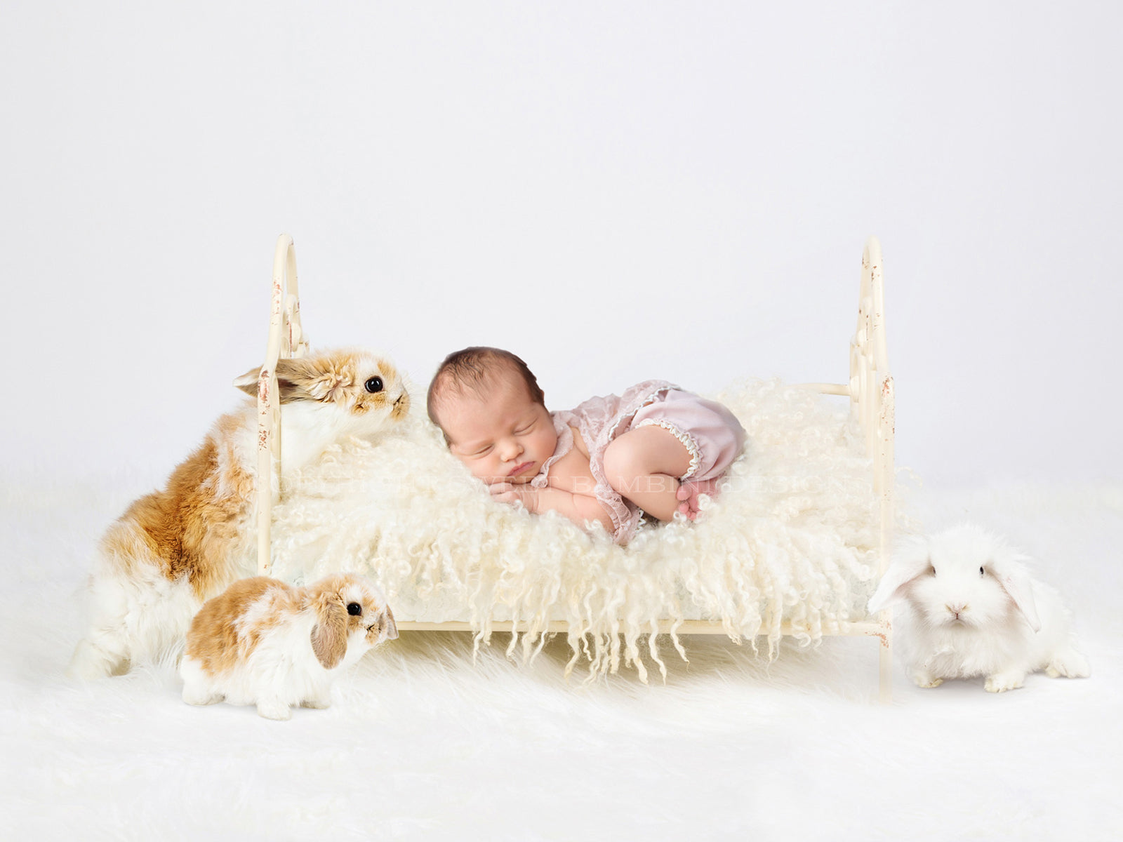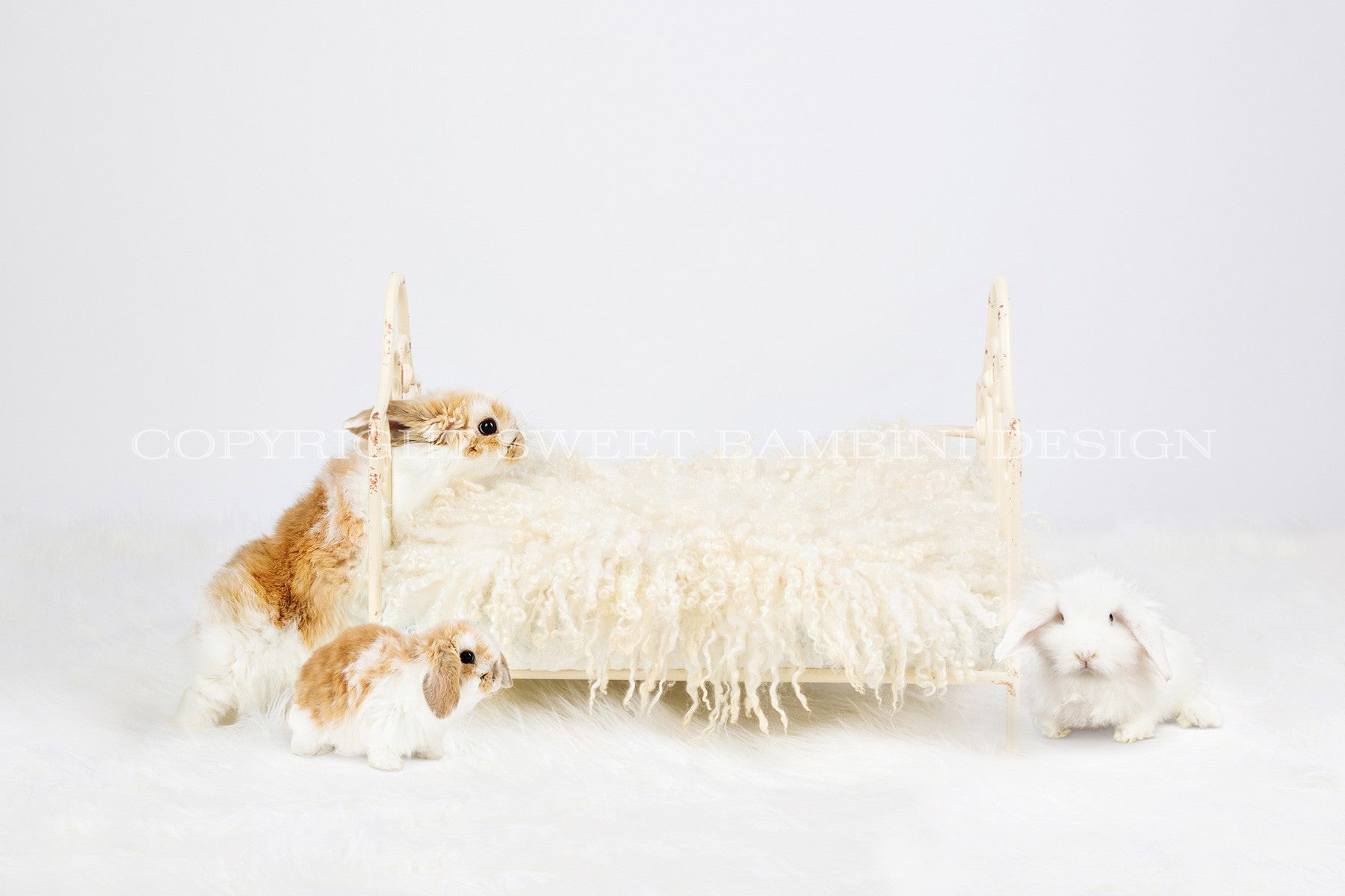 Perfect for Easter themed shoots, a little white bed on a off white backdrop and a fluffy rug, with a very cute and rather inquisitive bunny checking out what is going on, and two friends join him in this set up ( those are real bunnies).