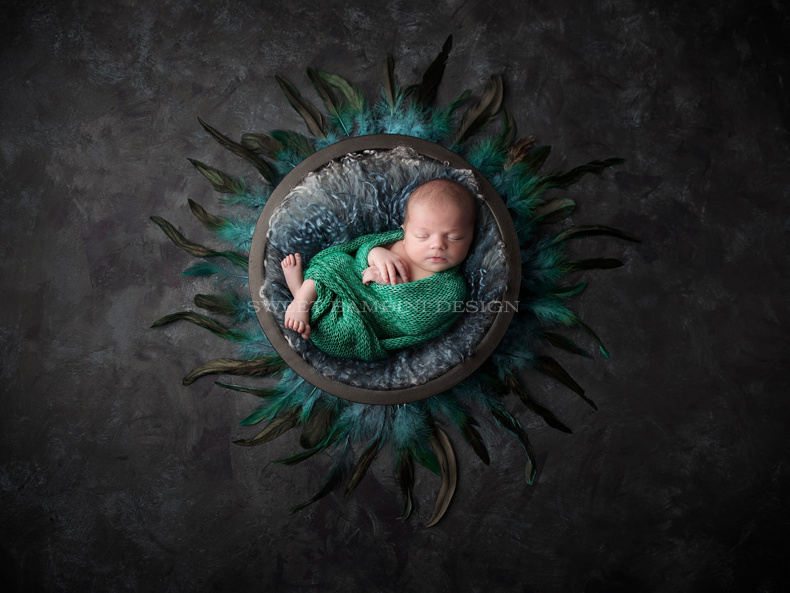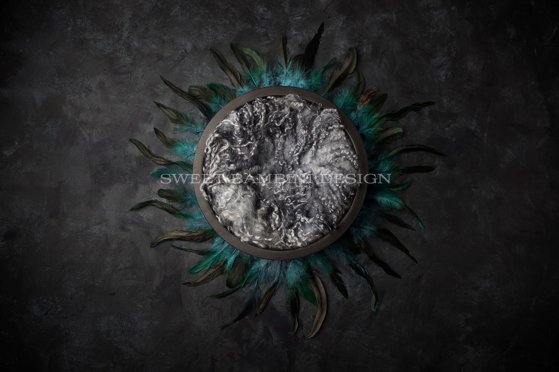 Newborn Digital Background - Dark grey bowl with turquoise feathers on charcoal background