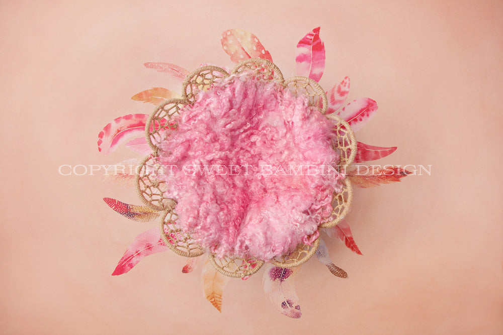 Newborn Photography Digital Photography Backdrop - beautiful nest made of pink curly fur in a woven bowl, on a lightly textured canvas background with feathers.