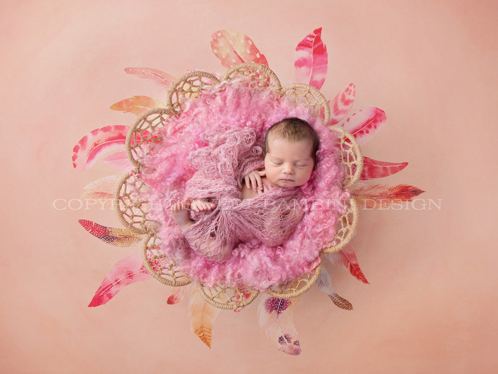 Newborn Digital Background for girls - Boho Girl feather nest in oranges, peaches and pinks