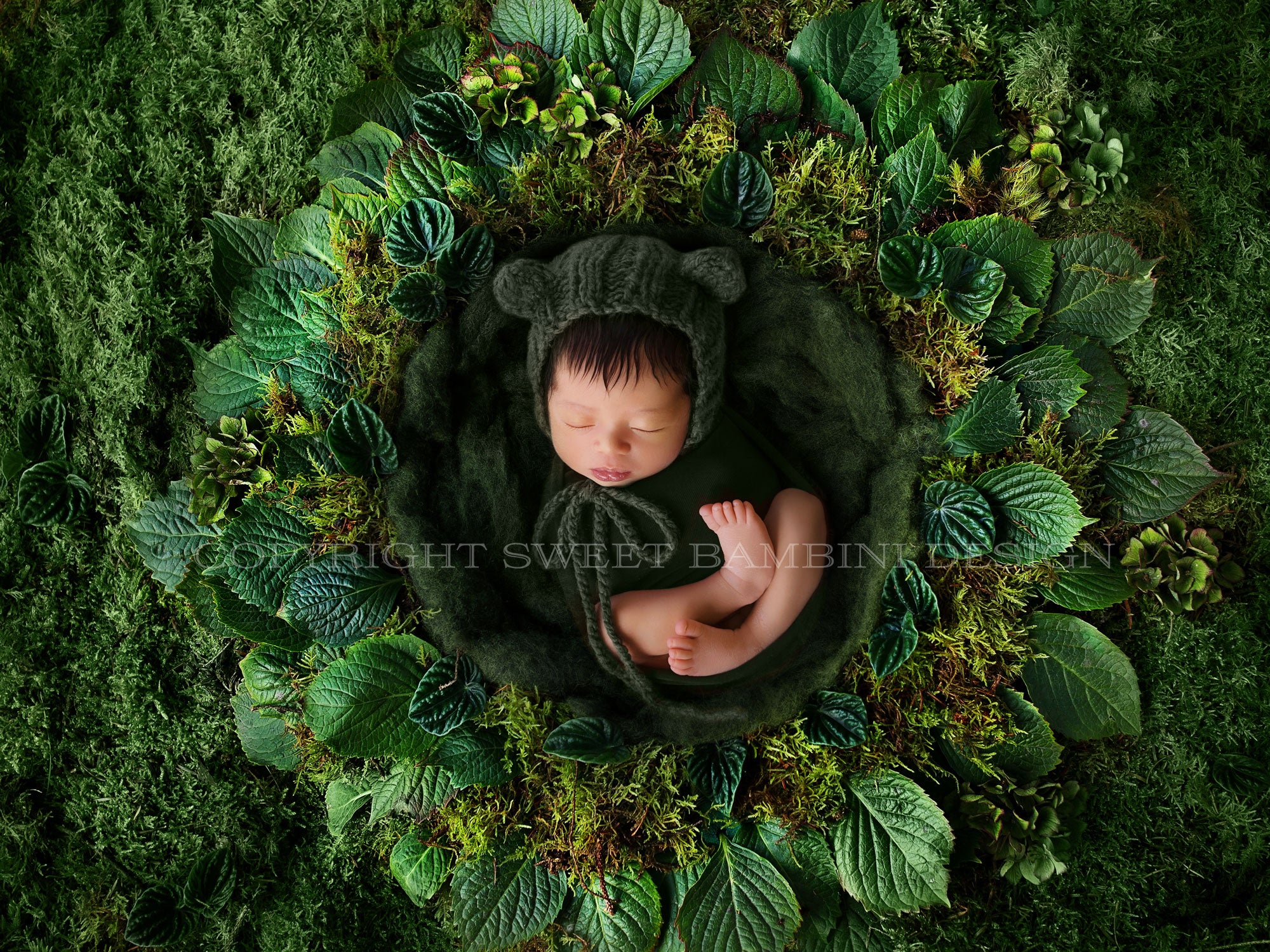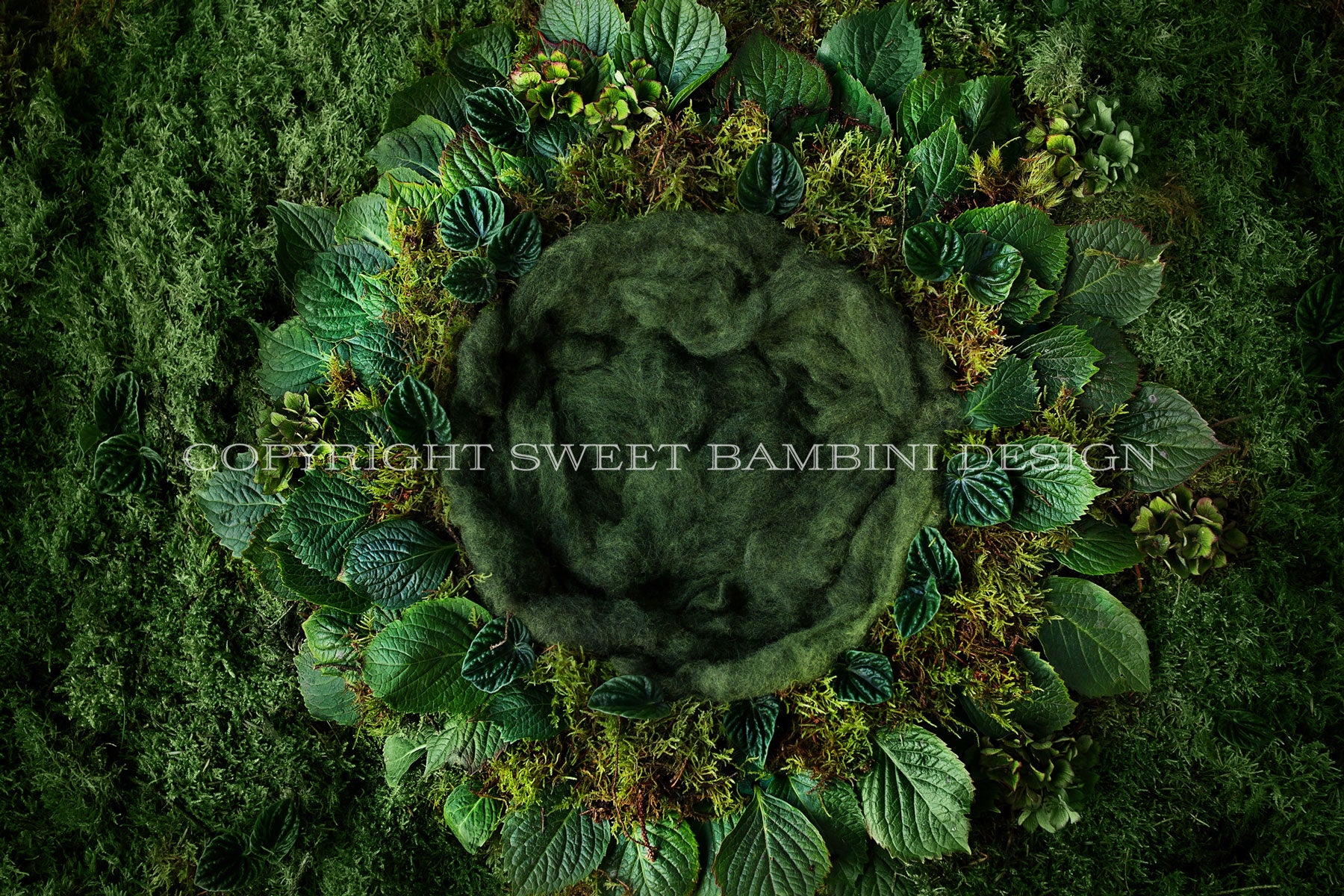 Newborn digital backdrop - Beautiful green nest made from fresh leaves and foliage against a fresh mossy background
