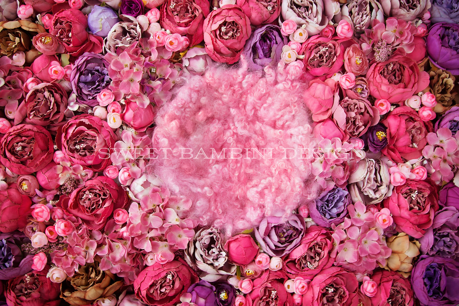 This is a gorgeous flower wall made with silk flowers, with a little nest in the middle for your newborn.