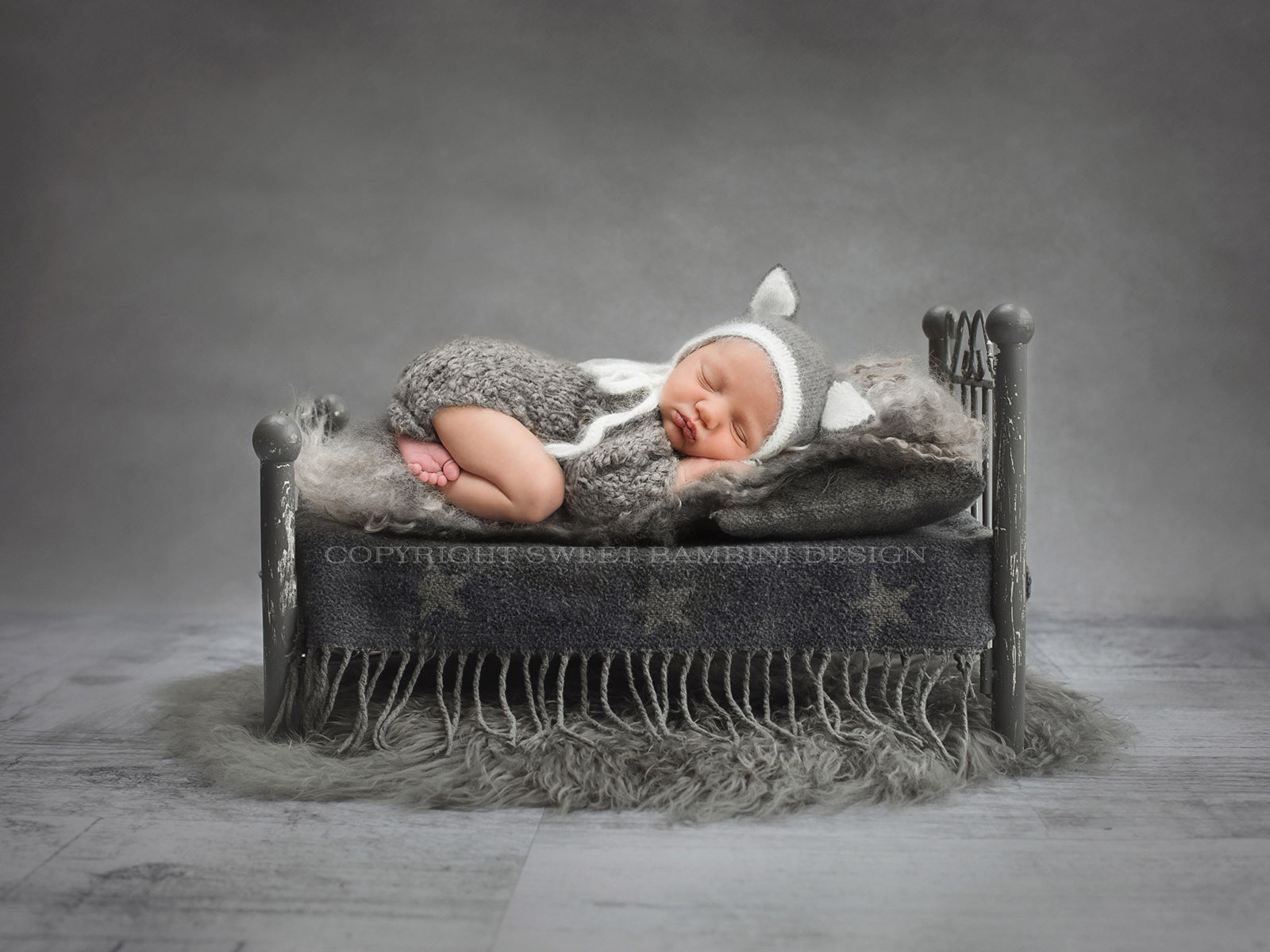 Newborn Photography Digital Photography Backdrop - beautiful little grey bed, shot with natural light. Shot on a lightly textured grey backdrop. Classic & timeless.