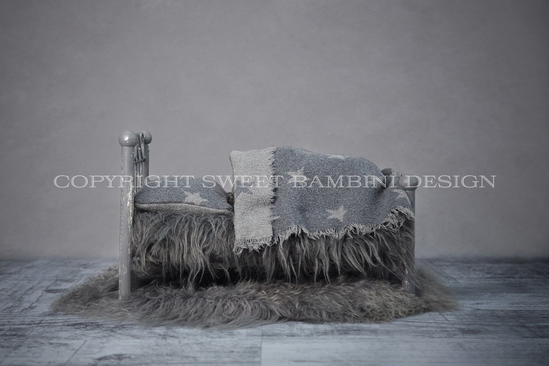 Newborn Photography Digital Photography Backdrop - beautiful little grey bed on a fluffy rug, complete with bed covers. Shot a textured grey backdrop.
