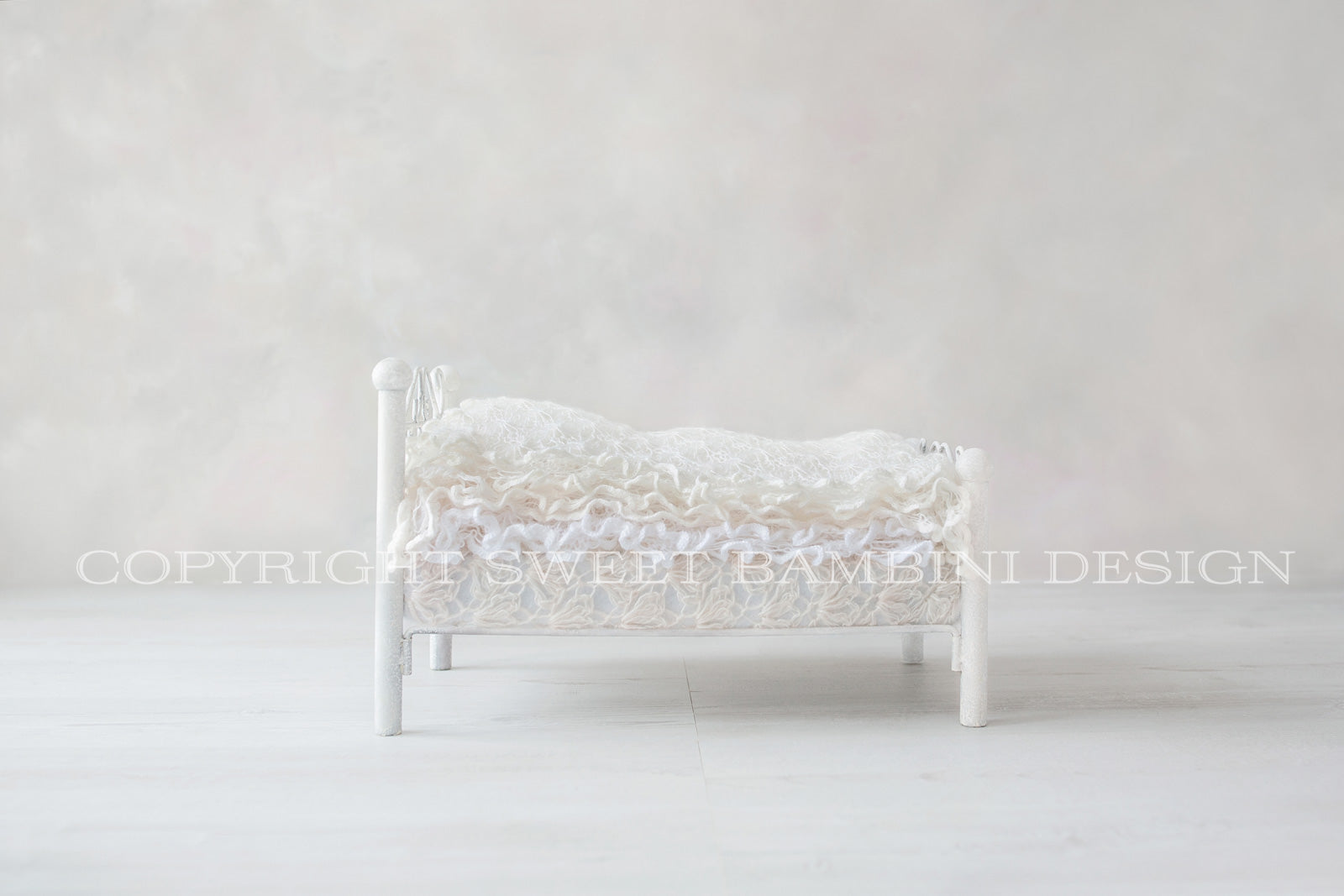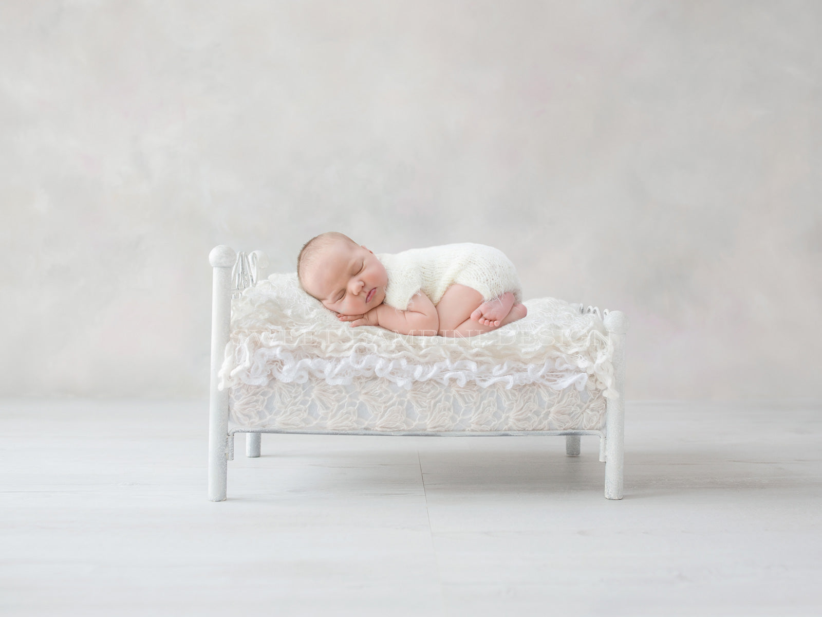 Newborn Photography Digital Photography Backdrop - Beautifully simple, white bed, shot on a hand painted, off white slightly textured background, perfect for girls. The layers are lovely lacy blankets to add a touch of feminine detail.